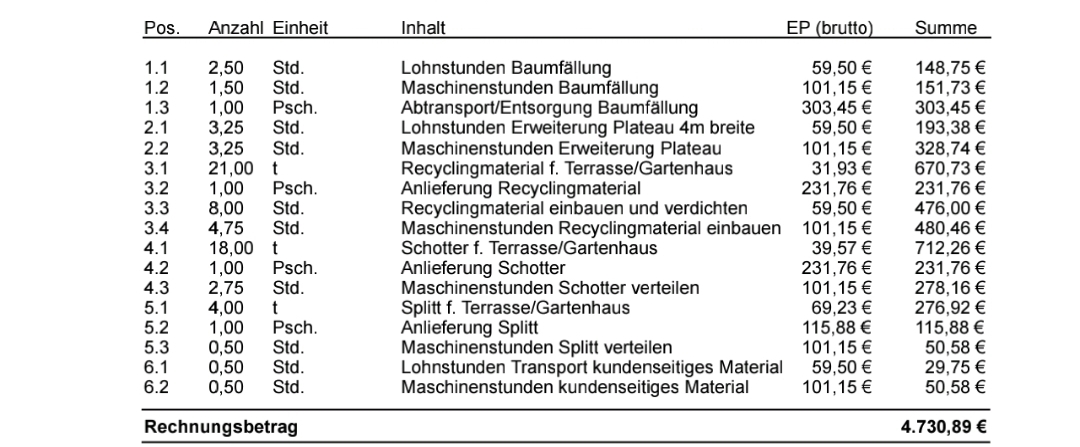 Diskutiere Rechnung im Bauvertrag Forum im Bereich Rund um den Bau; Hallo Leute hoffe ihr könnt uns da helfen. Wir haben bei unserem Bauträger im Garten vereinbart das es etwas anders gebaut wird, das Plateau 1m...