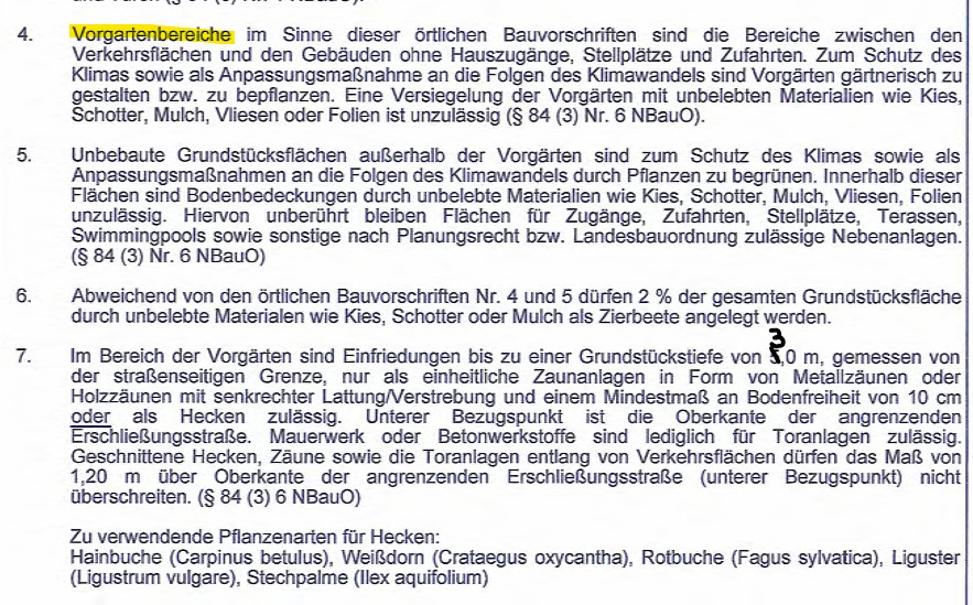 Zu 3.) Helle Häuser fordern und dann schwarze-Plastikzäune erlauben passt ja auch nicht zusammen. Für ein gutes Klima und Durchlüftung hilft das allemal weniger als eine hohe Hecke.