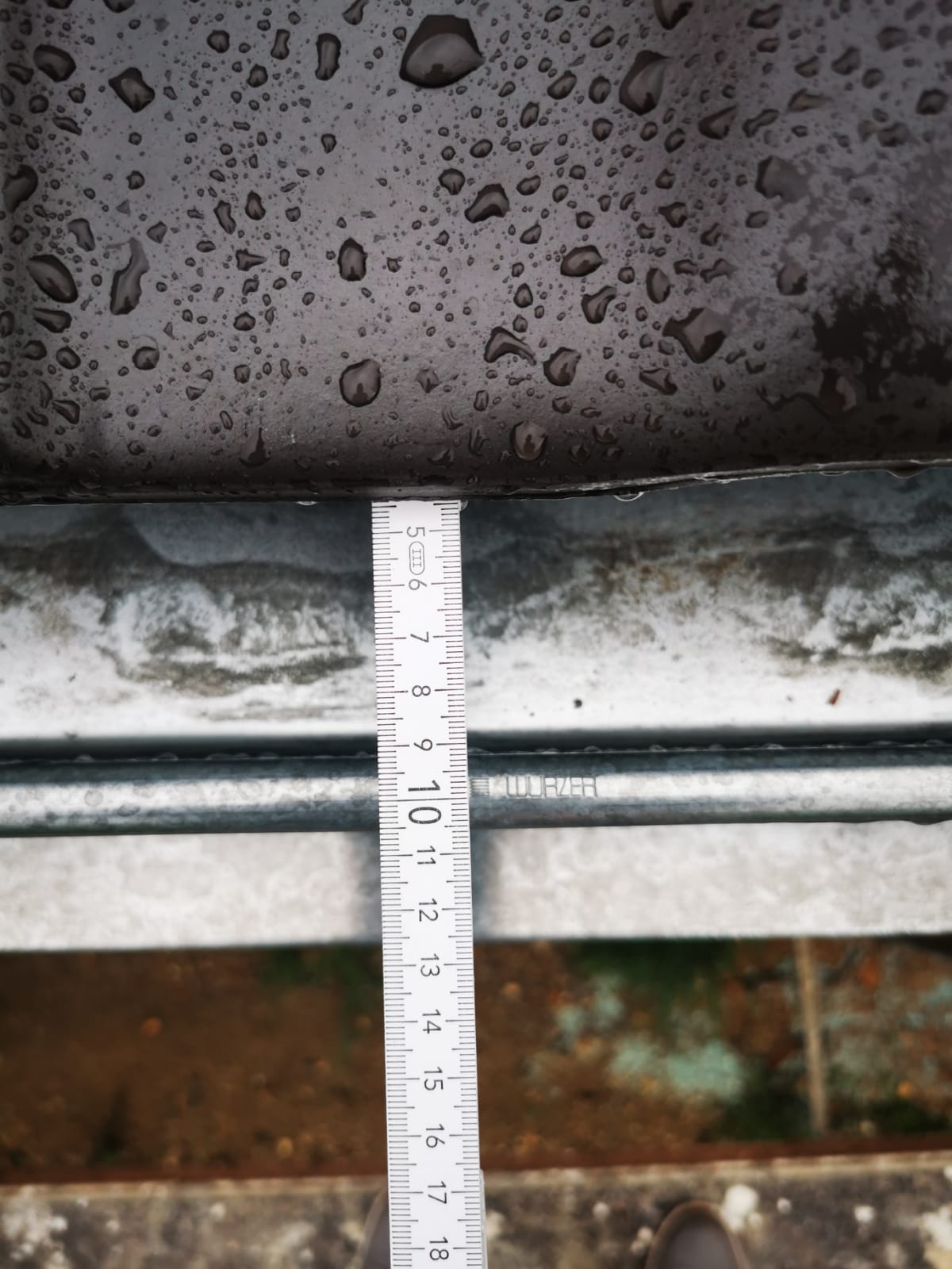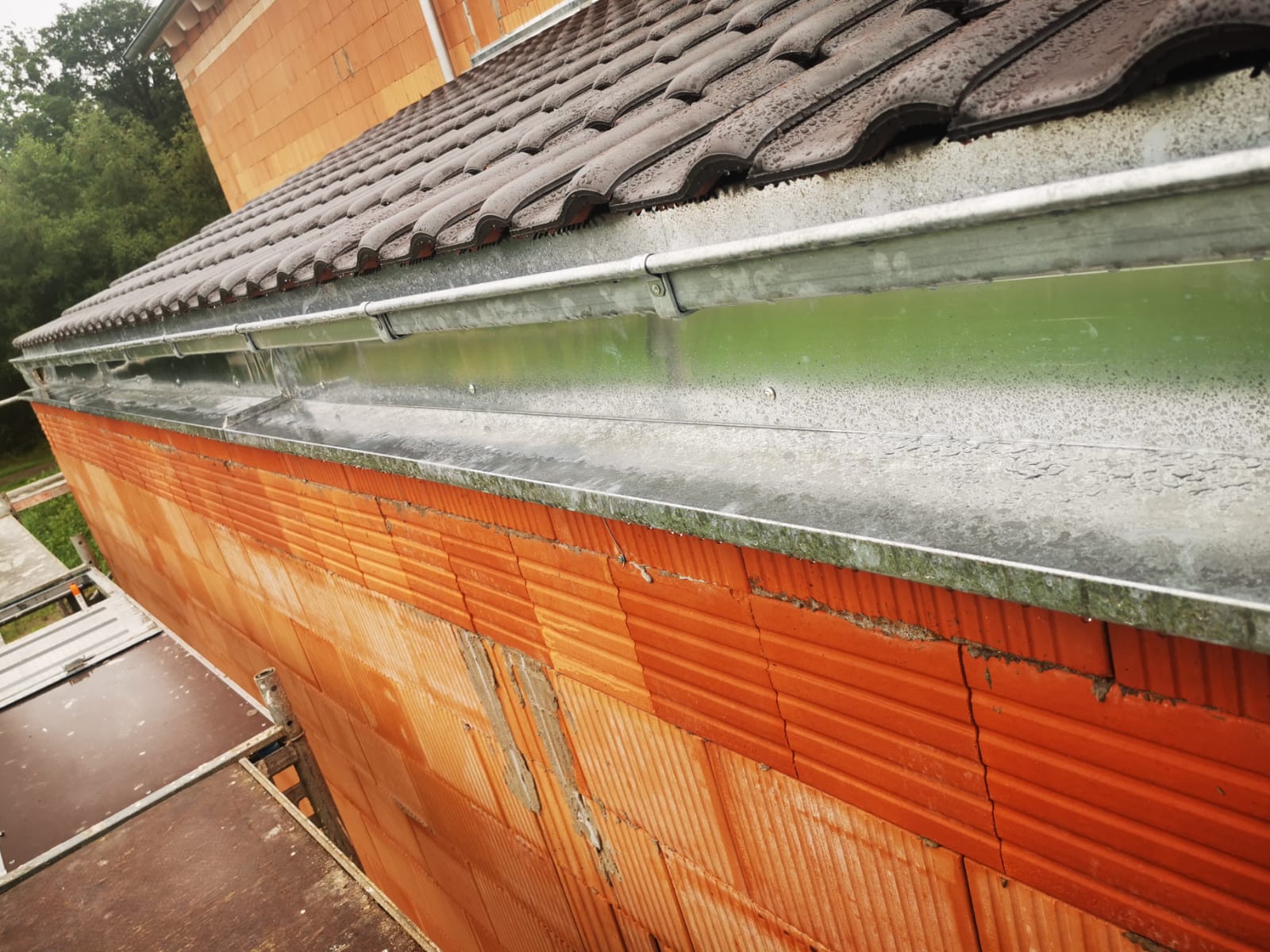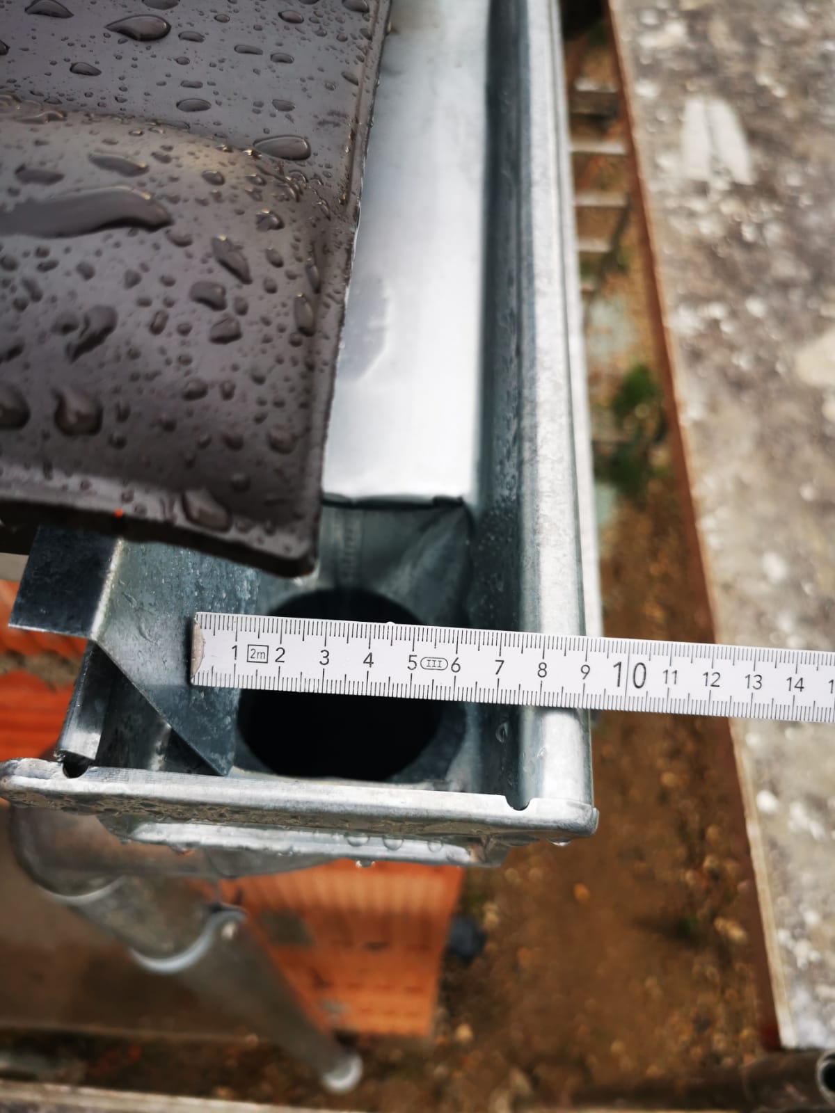 Und ich habe gelesen, dass die Dachziegel nur 1/3 in die Regenrinne reinragen dürfen. Unsere ragen 4.5 cm bei 9 cm Regenrinnenbreite herein.