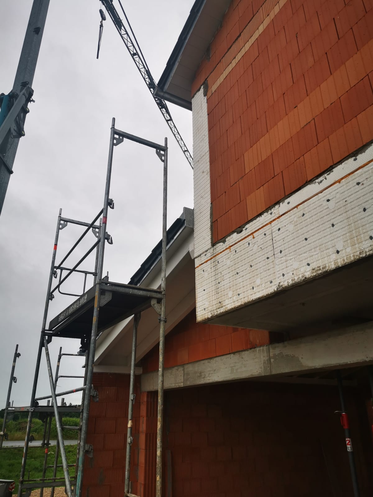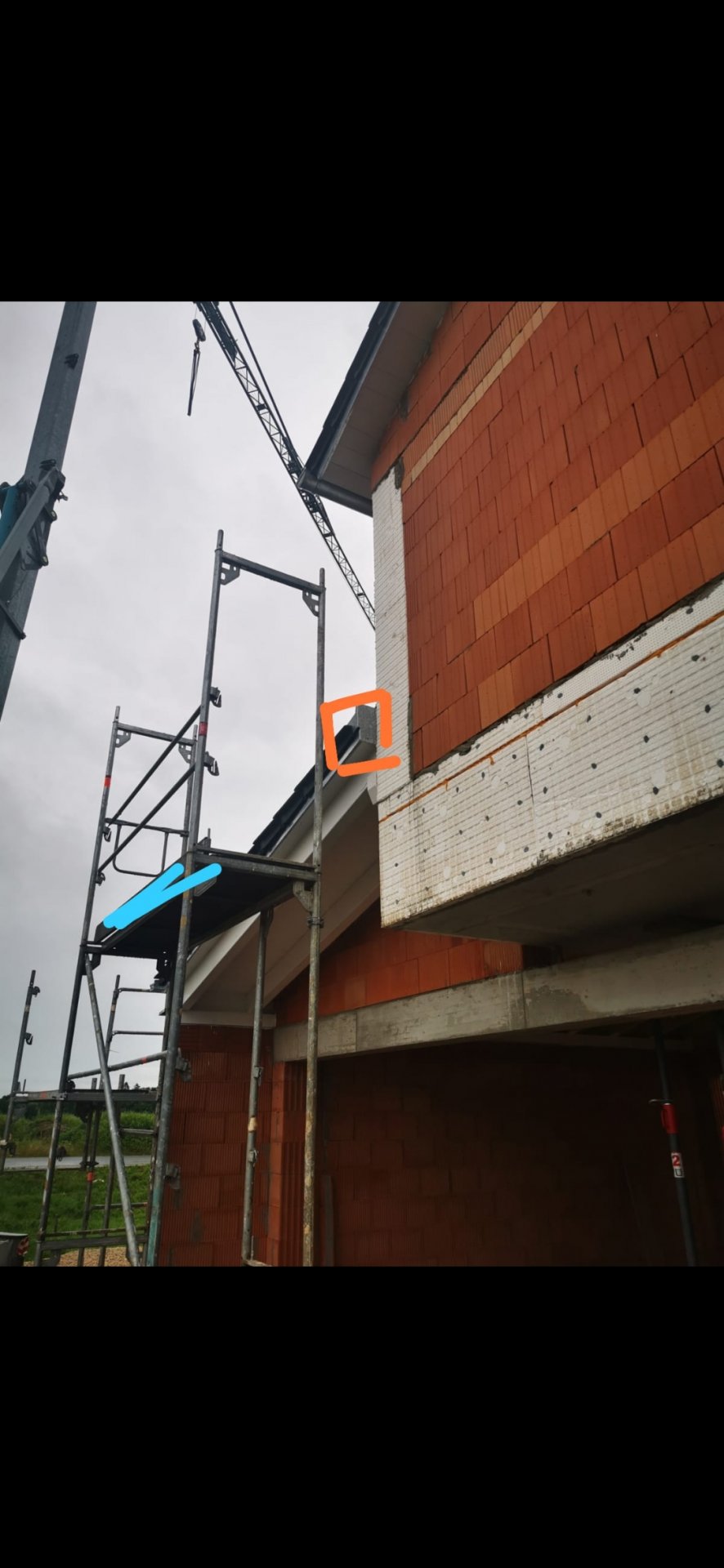 Die Mauer verlängern ist doch genau falsch. Die Mauer muss kürzer so ca. 1,5cm weit muss der schräg angeschnittene Balken vorstehen, damit man noch verputzen kann.