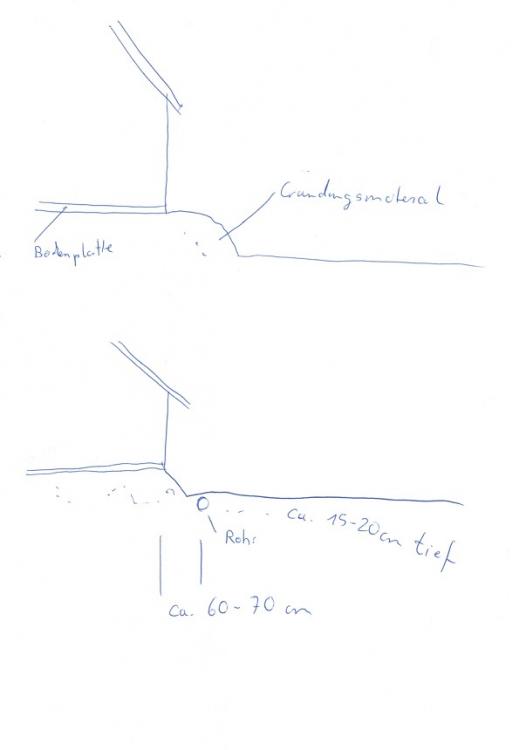 Laut Skizzen sieht das ja so aus, dass Ihr direkt neben der Bodenplatte den Schotter abgetragen habt. Zuerst hiess es in einer Entfernung von 60-70 cm Regenwasserleitungen verlegt.