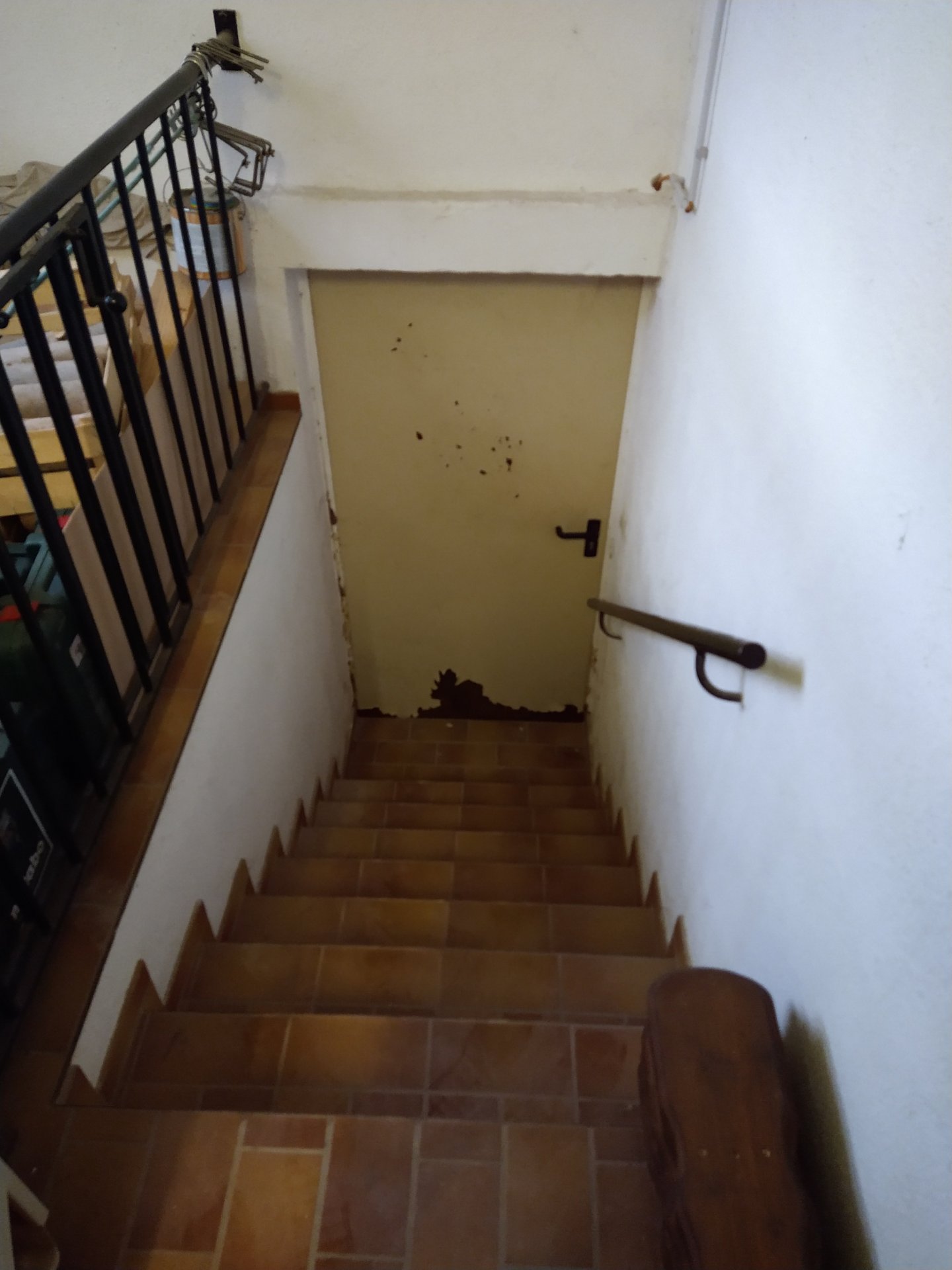 Diese Stelle ist ein Kellerabgang, der von einem Nebengebäude (nicht unterkellert) in den Keller des Wohnhauses führt. Also ein innenliegender Kellerabgang. Der Riss zieht sich auch an der Wand und Decke rings herum. Vermutlich wurden die Wände des Anbaus direkt an die Wohnhaus-Außenwand gesetzt und dort reist die Verbindung.