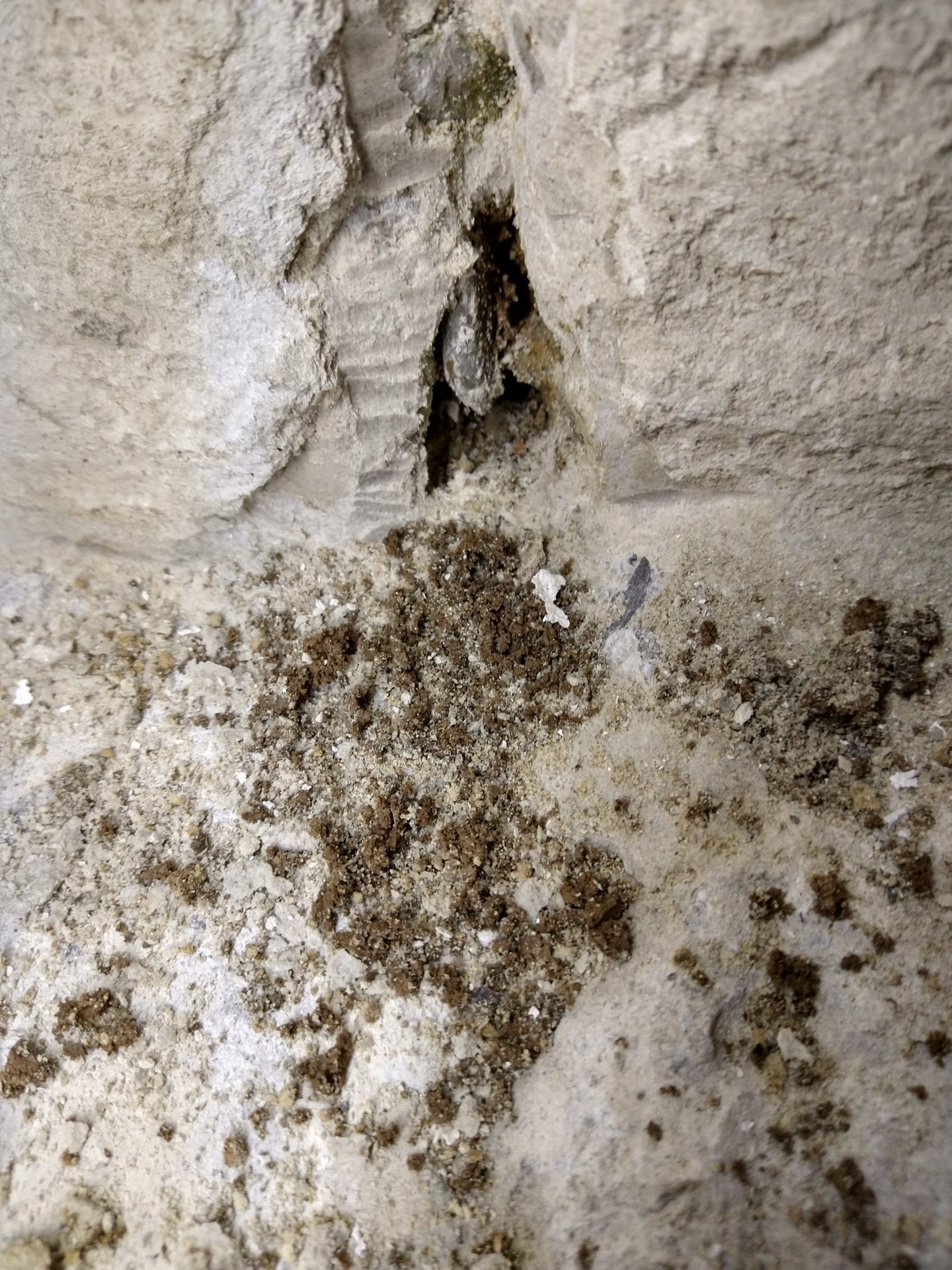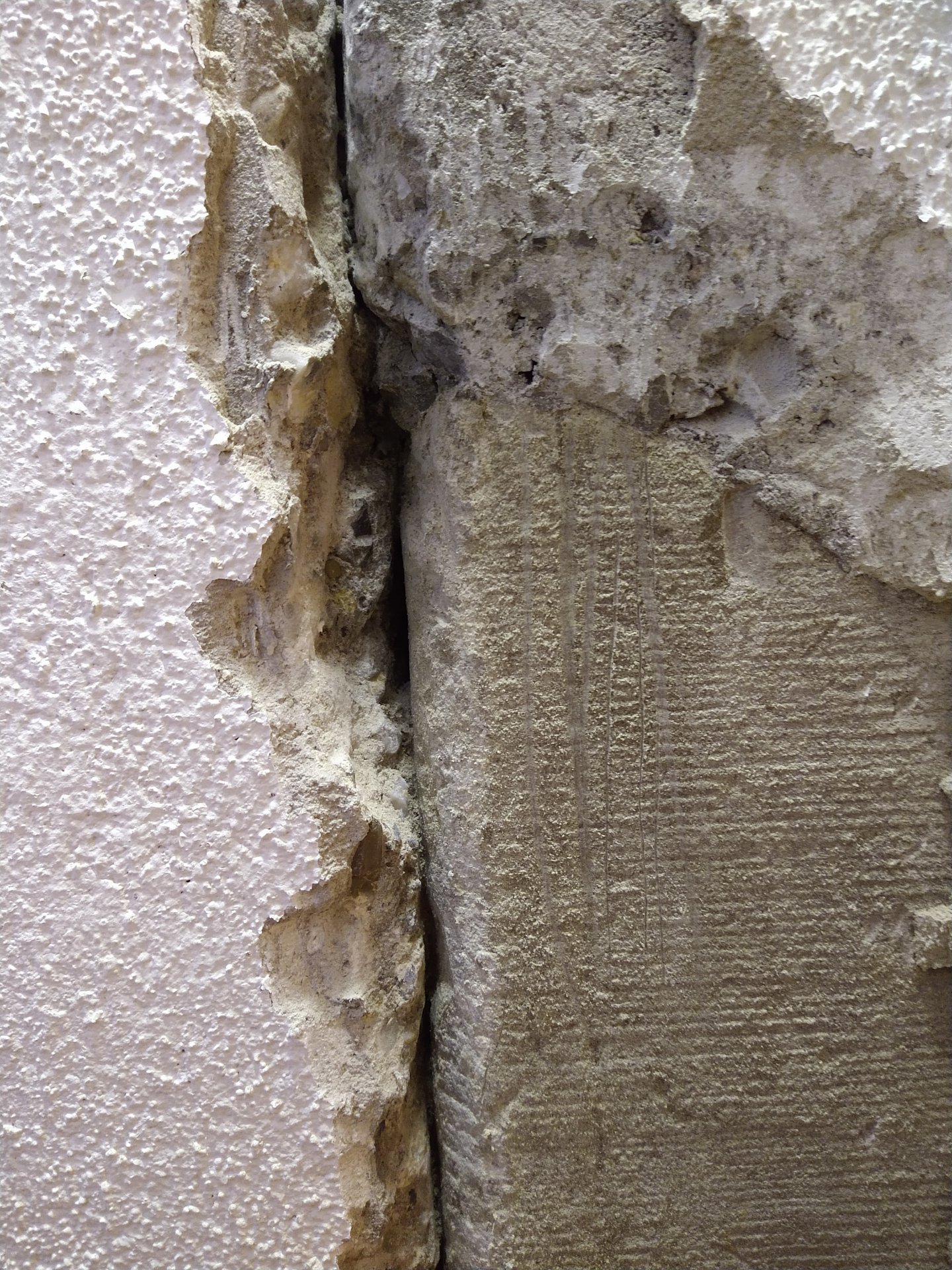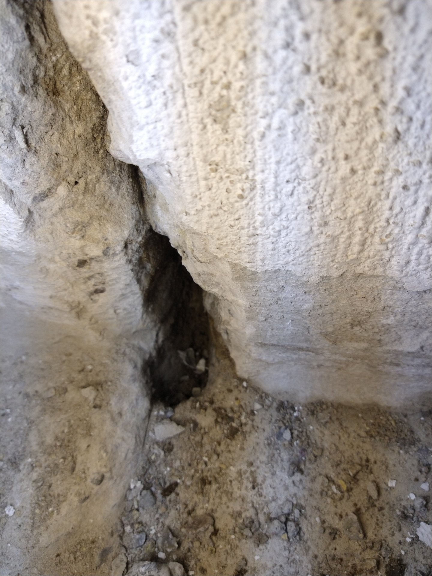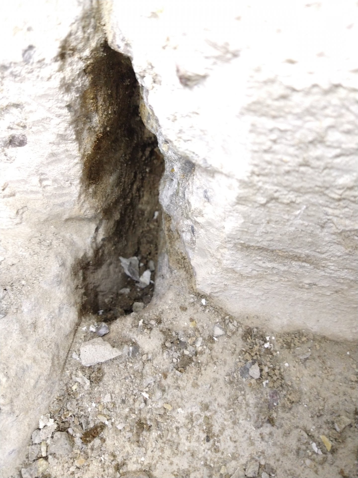 Besonders am Boden scheint damals schlampig gearbeitet worden zu sein. Dort ist das Streifenfundament (falls es hier überhaupt eines gibt - ist ja direkt Beton gegossen worden) nicht bis zum Sandstein angeschlossen sondern es klafft ein bis zu 2 cm großes Loch, wo man Lehmboden raus kratzen kann. Der Putz hat an dieser Stelle alles erstmal verdeckt und der Riss war ja nicht sonderlich groß. Aber dahinter war an einer Stelle in der Mauer und am Boden-Bereich lehmhaltiger Mutterboden zwischen Betonanschluss und Sandstein. Eventuell war der schon immer da, oder aber durch Regen in Hohlräume reingespült worden.