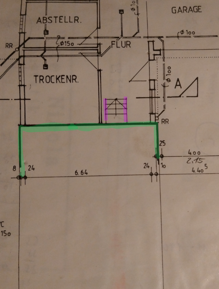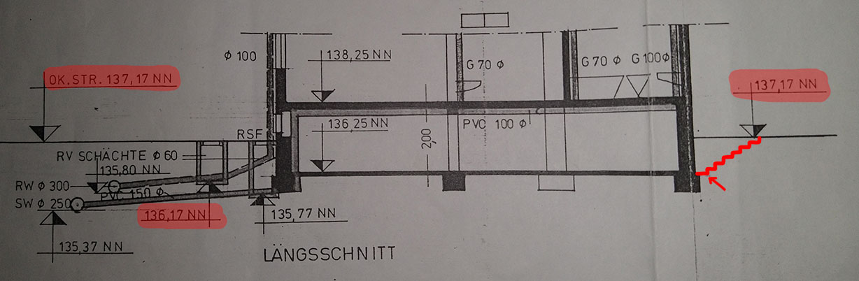 Grundriss stell ich im Anhang mal ein. Wie man dort sieht gibt es auf dem Bereich des Grundstücks quasi kein Gefälle, 137,17m NN ist Straße OK und auch OK Boden des Anbaus. Der Keller ist dann 136,25m NN.