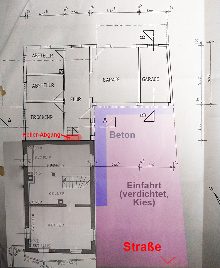 Die Fließrichtung kenne ich leider nicht. Es ist allerdings keine Hanglage, das Grundstück ist auf ca 140m über NN in der Nähe von Straßburg auf deutsche Seite, also Recht nah am Rhein. Ein kleiner Abzweigender Fluß (Kinzig) liegt ca 500 m entfernt, der Rhein selbst etwa 2 km. Es ist recht eben hier, auf 30 m Grundstückslänge würde ich etwa 1 m Höhenunterschied schätzen. Das Grundstück fällt von der Straße her leicht ab zum Wohnhaus. Zwischen Straße und diesem Kellerbereich liegen etwa 18m, wobei der Bereich mit dem Wohnhaus überbaut ist. Es ist also versiegelte Fläche, wenn man so will.
