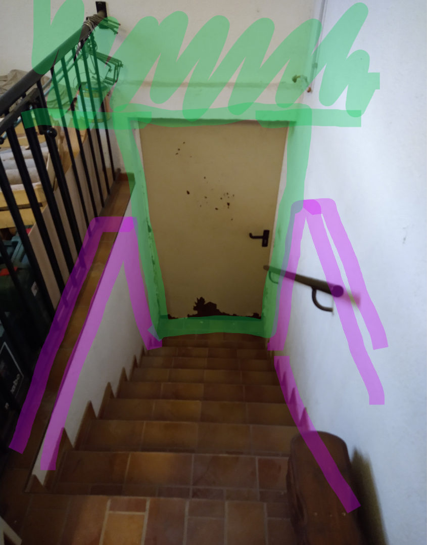 Ich mach mal eine kleine Grafik. Der grüne Bereich ist die alte (außen-)Wand des Hauses, Naturstein im Keller, ab Geländeoberkante Vollziegel gemauert. Die Türeinfassung wie gesagt in Sandstein. Der lila Bereich ist die Betonwand, die zum Keller herunter führt. Das Foto ist vom Anbau aus, der Keller gehört zum alten Gebäude. Der Anbau wurde hier also direkt an die Aussenwand des Hauses angesetzt.
