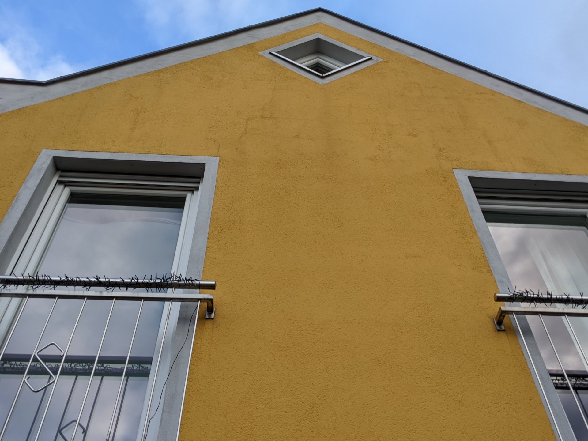Flecken und Risse auf verputzter Fassade