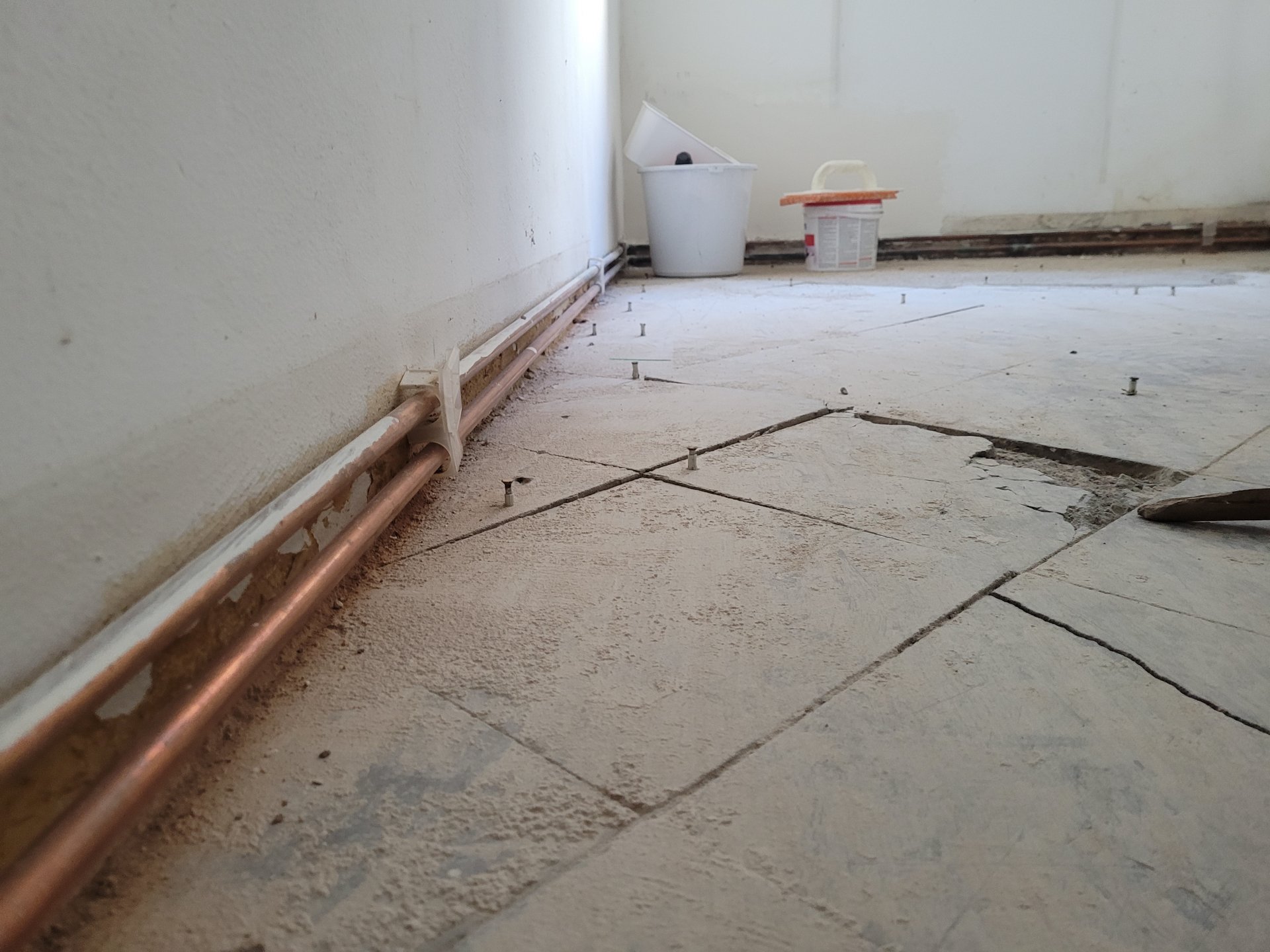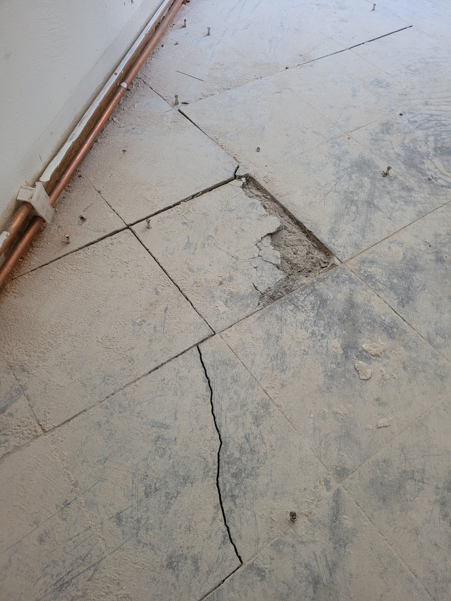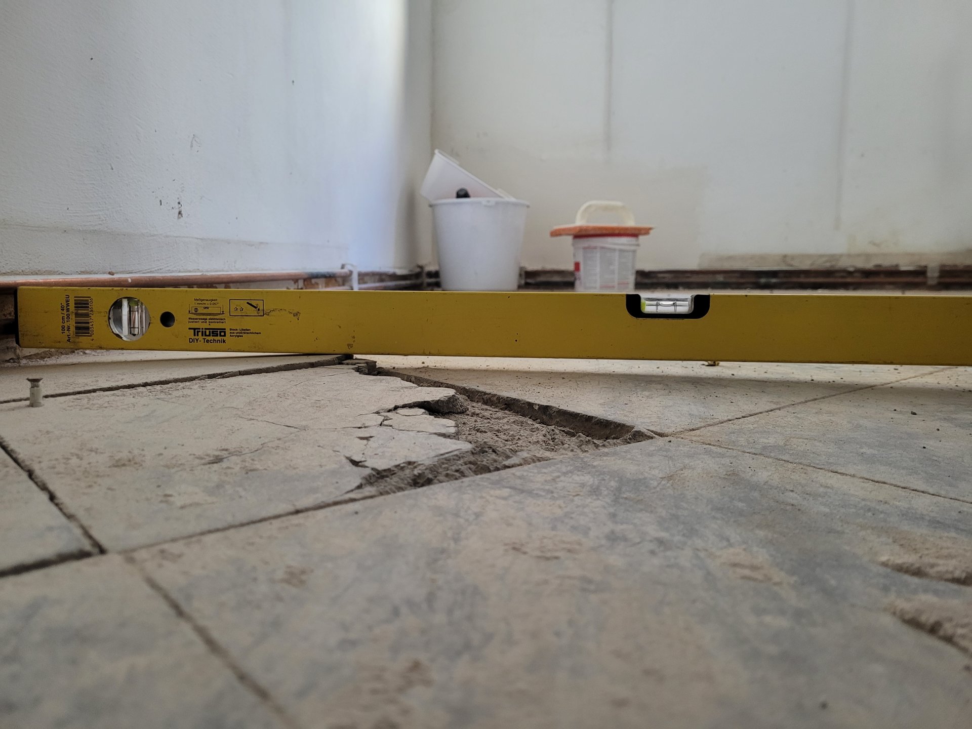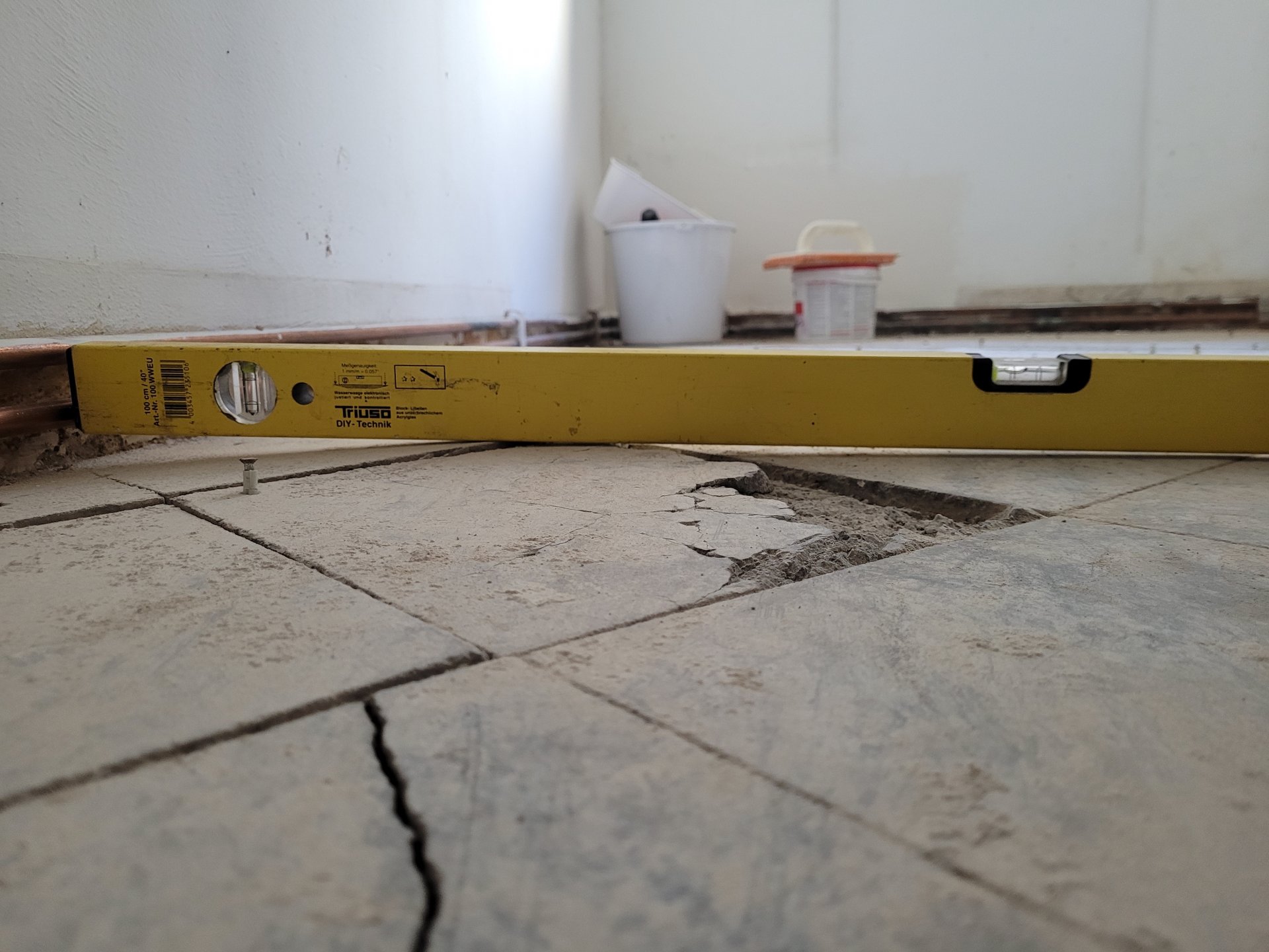 Riss in Steinfussboden: Hallo zusammen, ich habe ein Haus übernommen (Altbau, Baujahr ca. 1910). EG ist gemautert, ab 1. OG Fachwerk. In Küche und Bad sind (vermutlich... -
