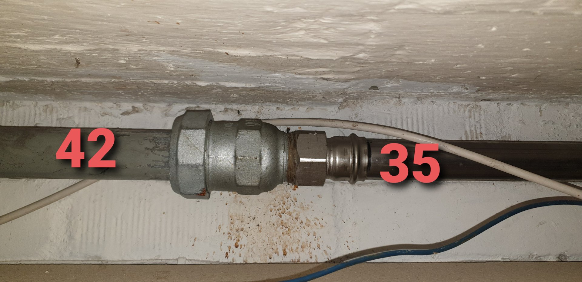 ich möchte das linke Stahlrohr auf dem Foto gegen ein 40mm Verbundrohr tauschen. Wie bekomme ich den Übergang zum bestehenden Edelstahlrohr hin? Wie ich es sehe, ist da eine Innengewindeverschraubung installiert, allerdings weiß ich nicht wieviel Zoll und was ich dann auf dem Verbundrohr benötige. Ich habe einen Press-Übergang mit Außengewinde in 1 1/4" und 1" gefunden, was aber wenn hier ein 1 1/2" benötigt wird!? Wie finde ich das raus?