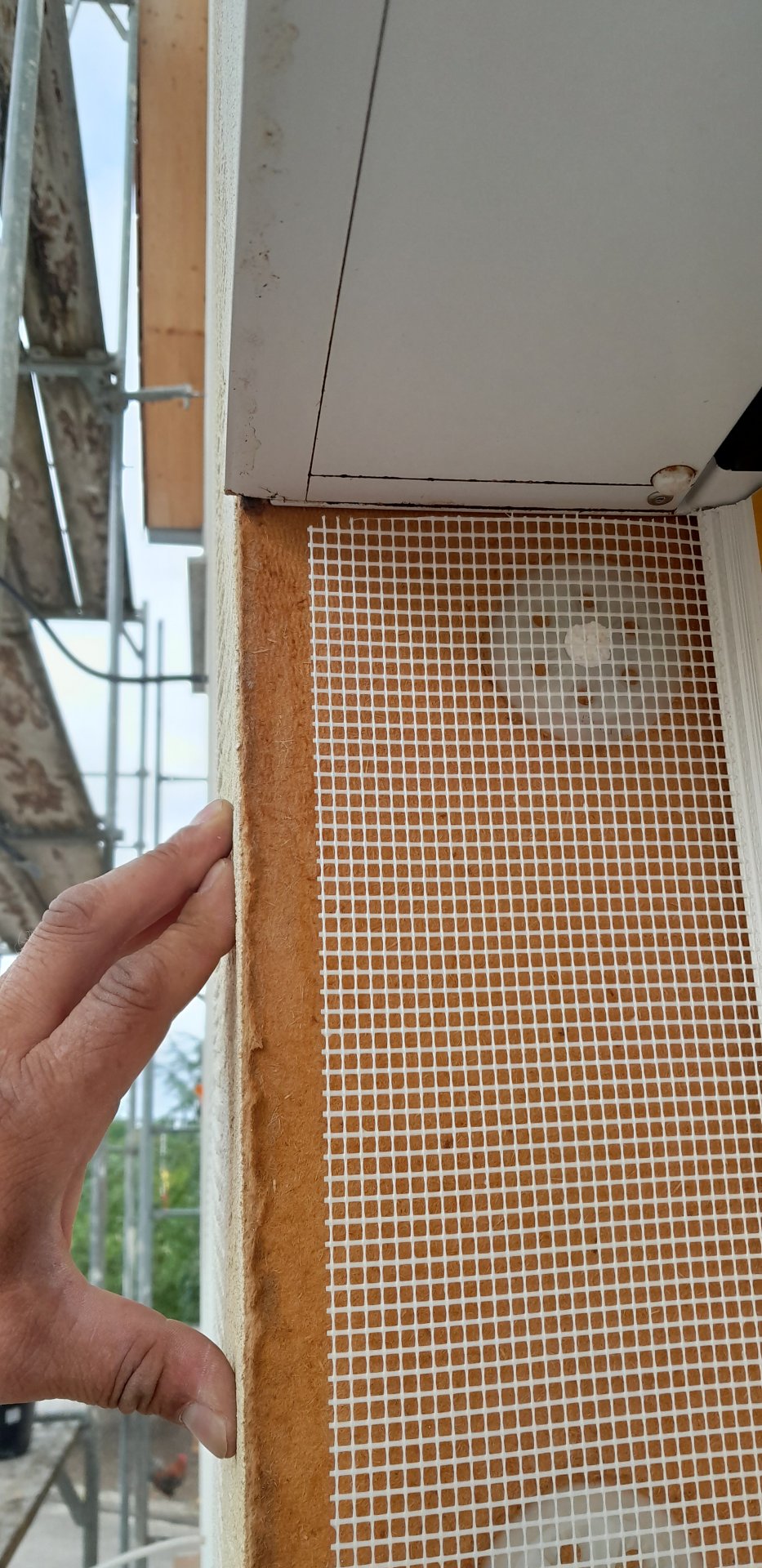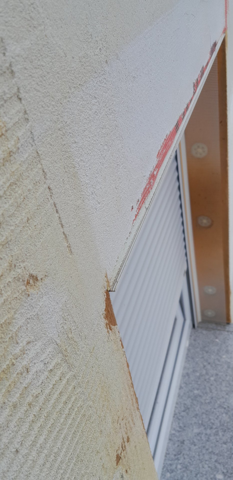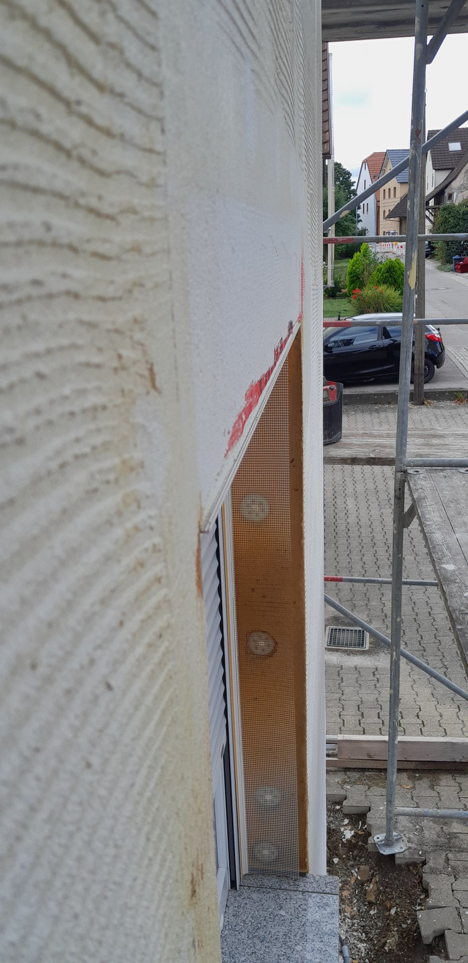 Die Kante Rollladenkasten ist mit Kratzputz schon auf einer Flucht.Es kommt ja noch Armierungsgewebeschicht noch drauf,danach Scheibenputz.