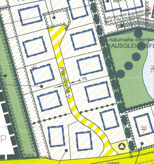 Unser EFH wäre ja am Ende dieser Straße. Die Entwässerung erfolgt durch die Privatstraße/Planstraße in den Kanal unterhalb der öffentlichen Straße. Es ist ein Trennsystem, aber der Einfachheithalber hab ich das hier mal weggelassen. Die Rückstauebene soll die öffentliche Straße sein, wobei mir das nicht so ganz klar ist...
