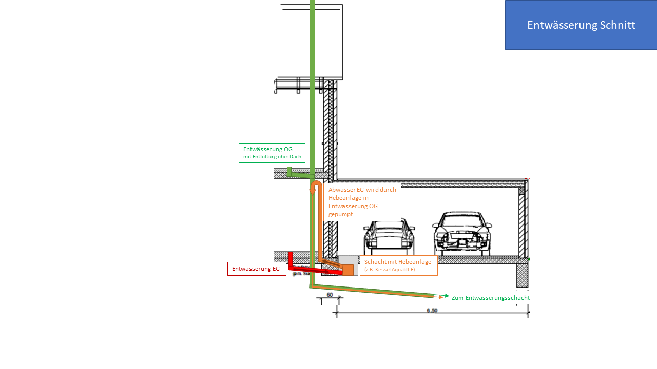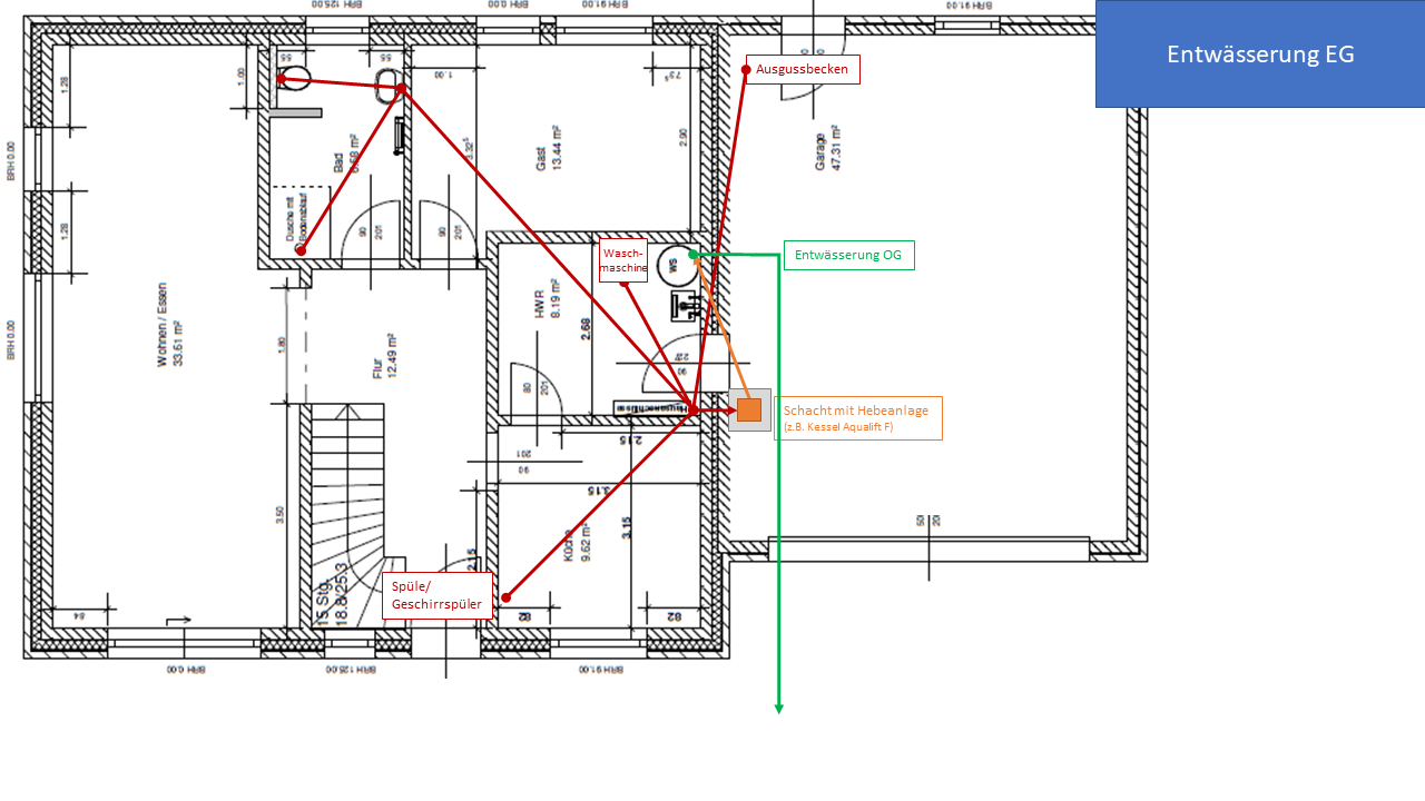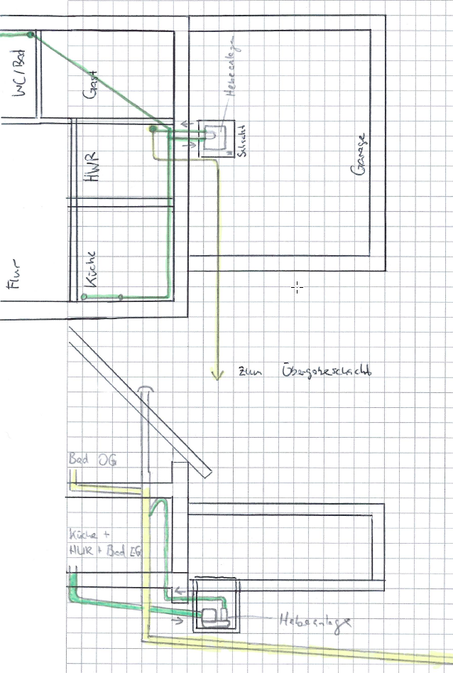 Ich hab das mal versucht aufzumalen. Würde so funktionieren oder? Also das die Hebeanlage in der Garage steht und das SW in das Abwasserrohr vom OG leitet, welches innen durch die Bodenplatte nach draußen geht.