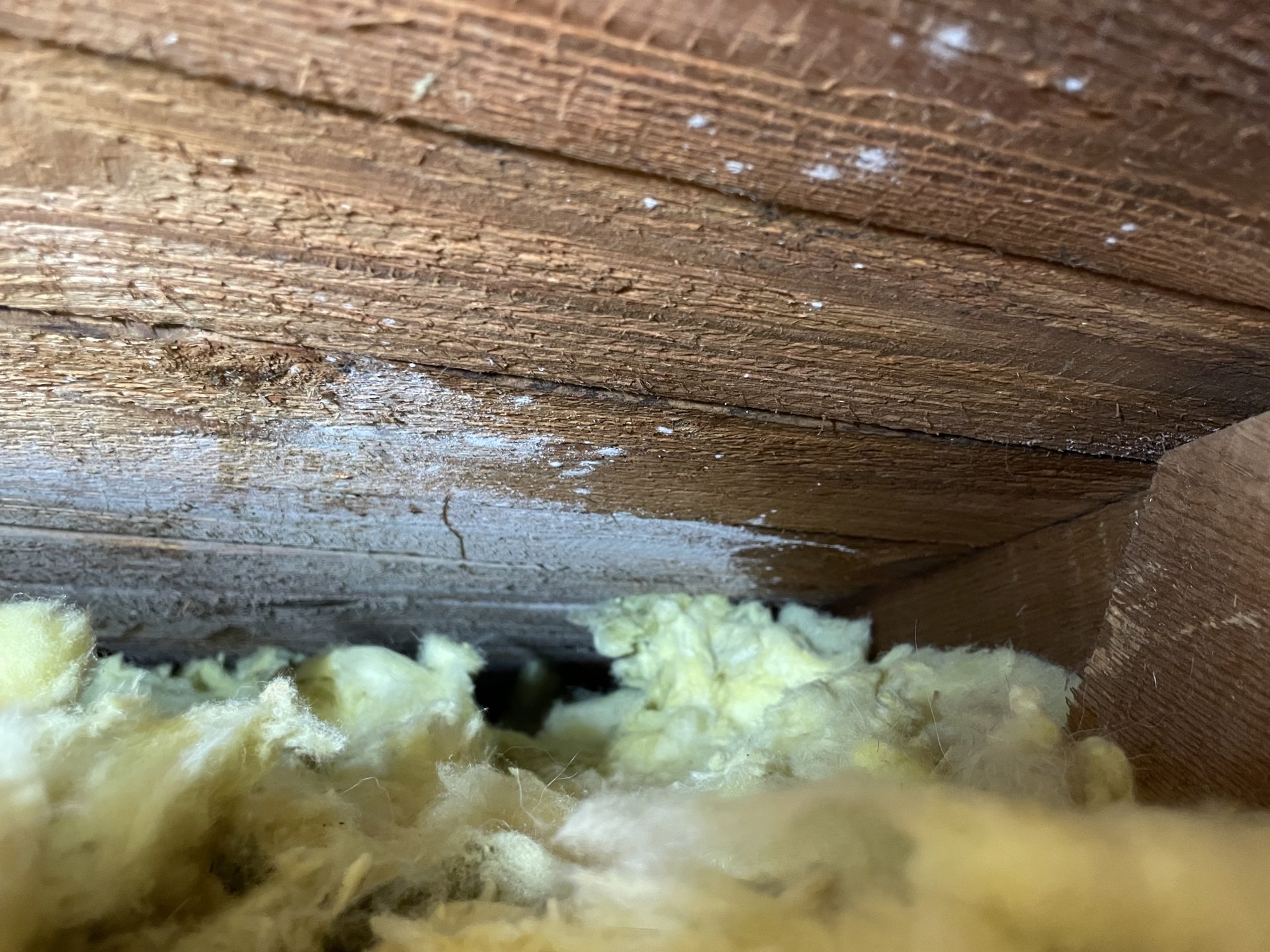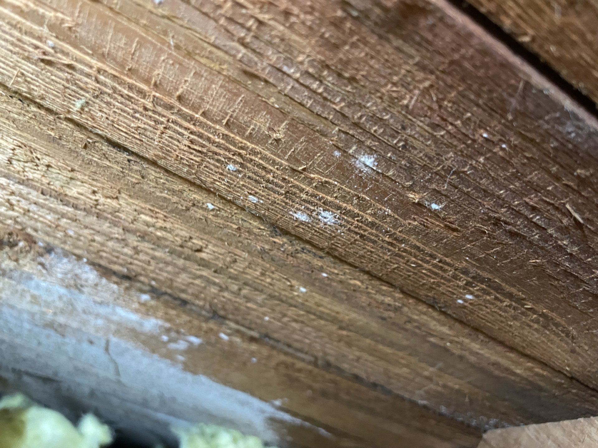 Schimmel im Dachstuhl?: Hallo, ich habe heute festgestellt, dass unsere Balken im Dach alle einen weißen Belag haben. Mir fällt es aber schwer zu erkennen ob es sich um...