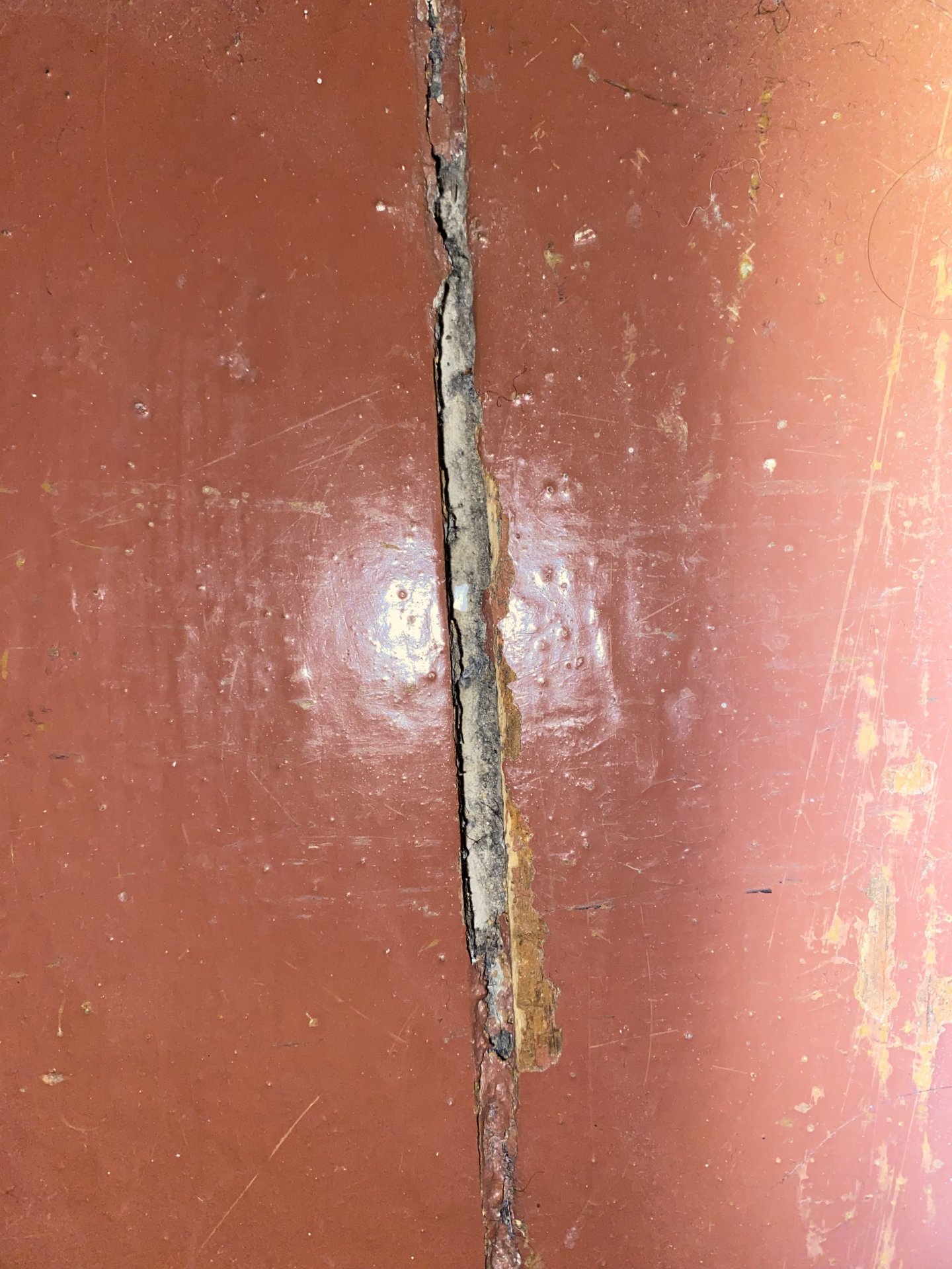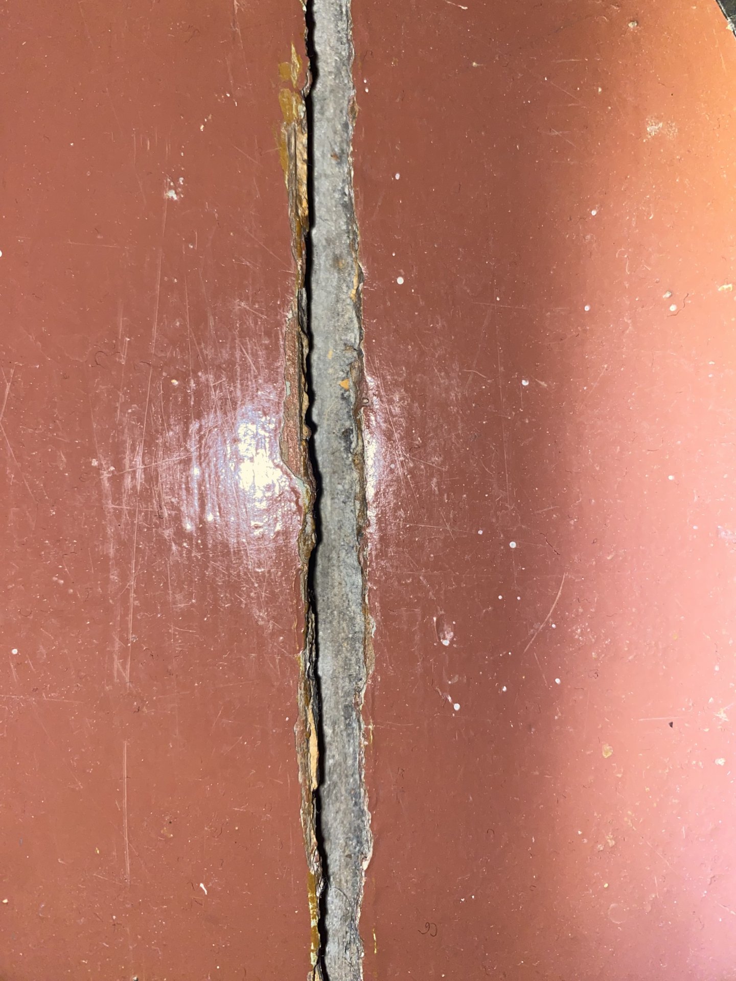 Ich sehe da eine beschädigte Lackierung, darunter das Holz der Dielen und in den Fugen ausgebrochenen Kitt.