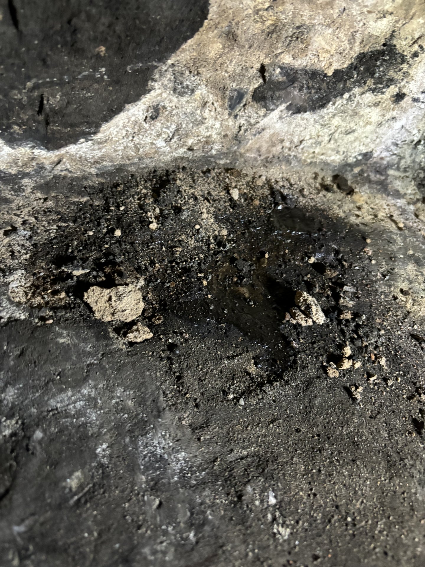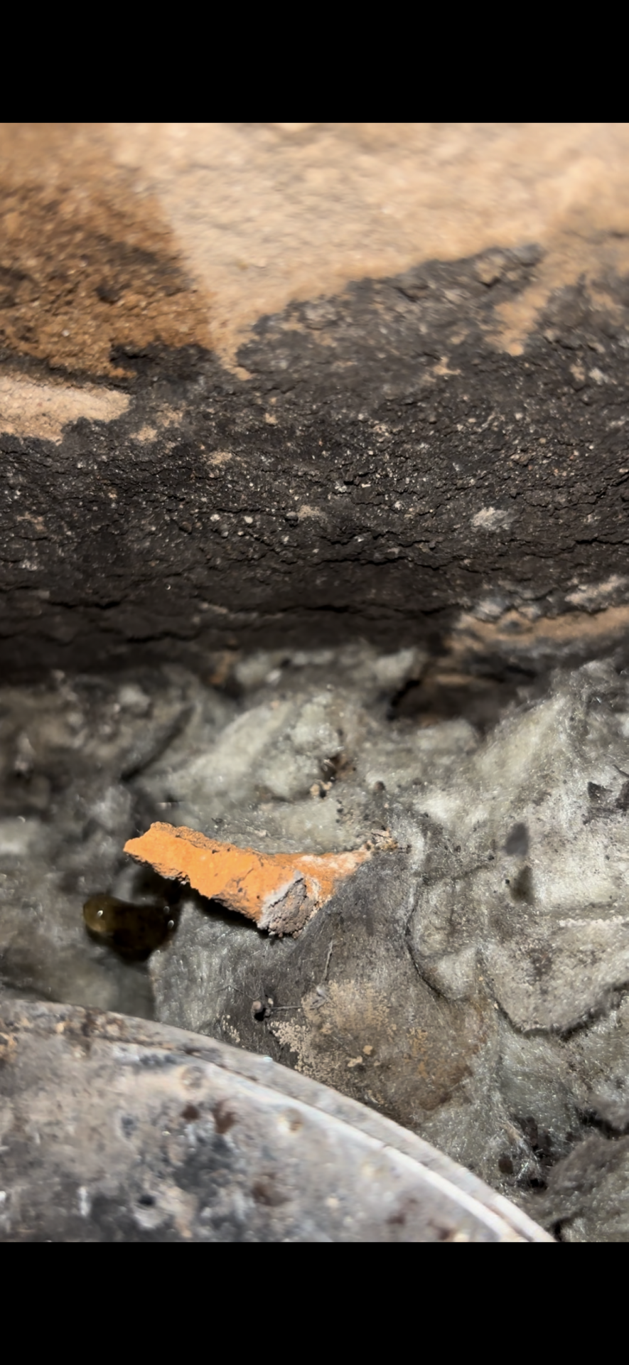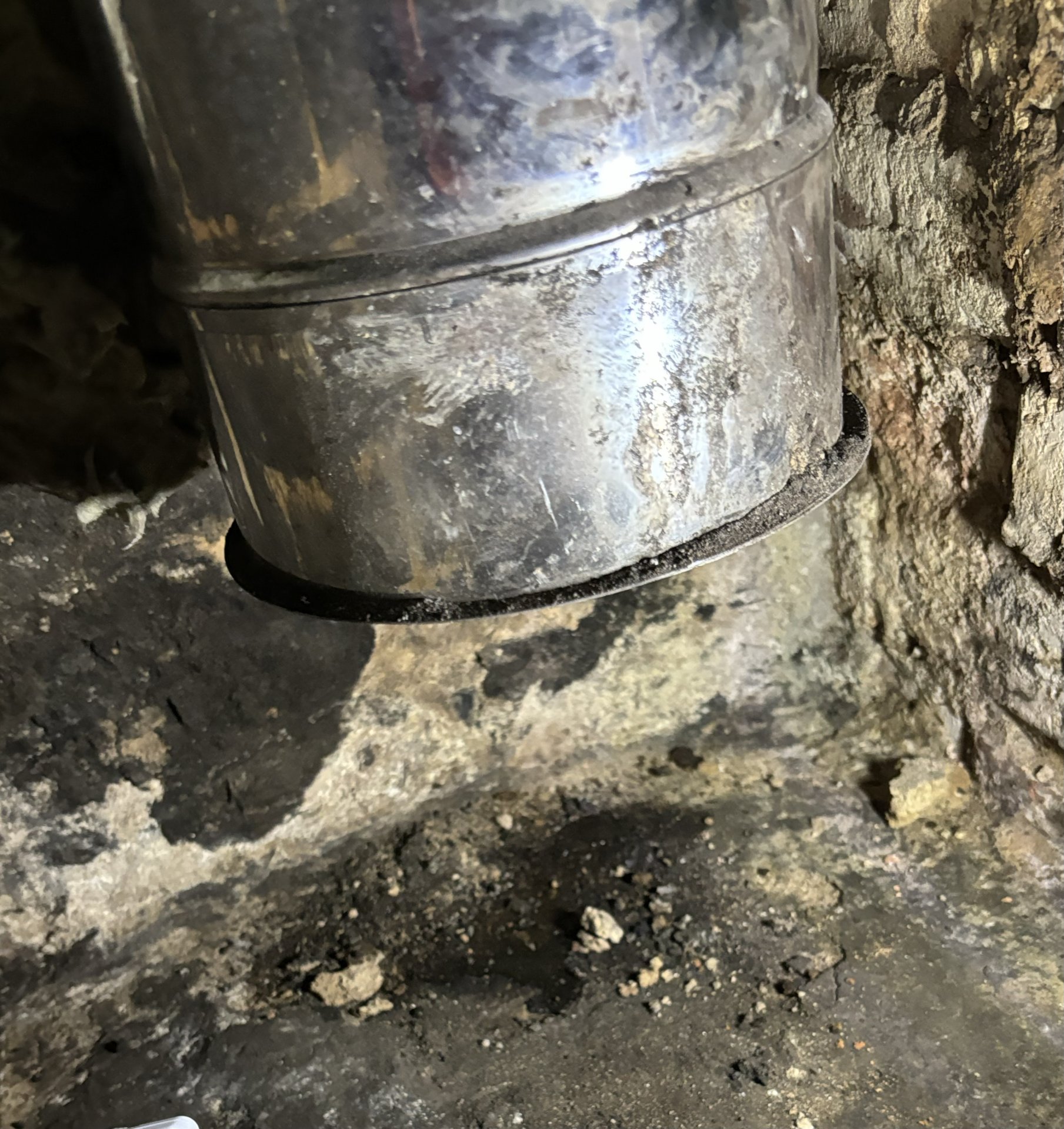 Das zweite Bild zeigt den Grund des alten Schornsteins. Hier kommt hinter dem eingezogenen Edelstahlrohr Regenwasser rein. Der gesamte alte Schornstein wurde mit einer Edelstahlplatte abgedeckt, durch welche die neueren Edelstahlrohre durchgehend.