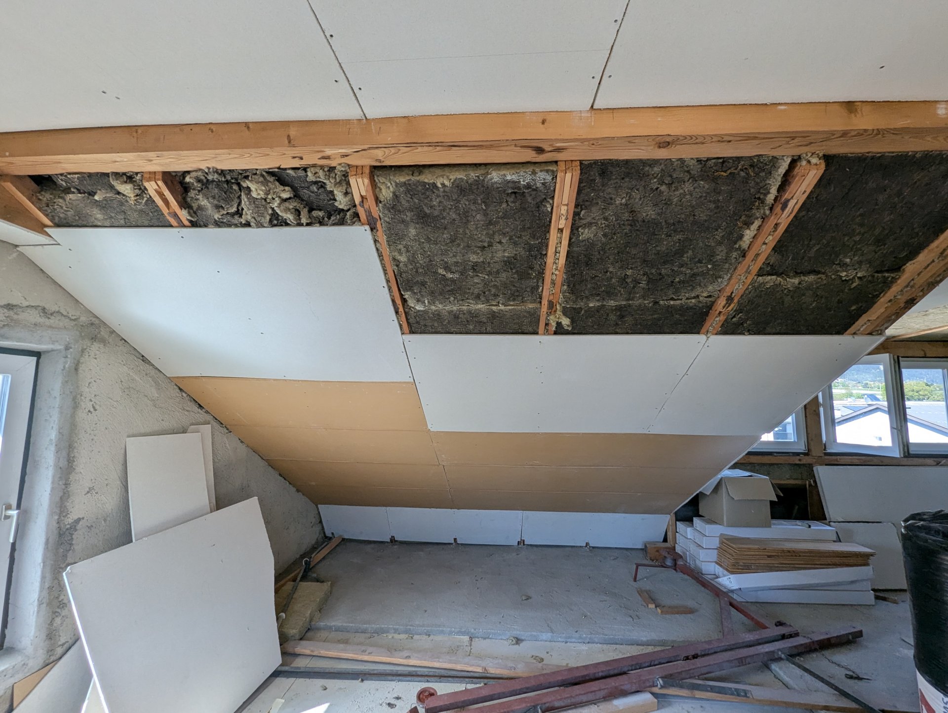 Im Zuge der Renovierung 1994 wurde in Eigenleistung versucht, die Dachschrägen zum Dach zu dämmen. Es wurde Dämmwolle zwischen die Balken gelegt, jedoch wurde keine Dampfsperre verbaut. Die Wolle ist komplett trocken, und wir hatten auch keine Feuchtigkeitsprobleme am Dachboden, doch hat sich über die Jahre die Wolle schwarz verfärbt.