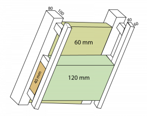 Ich könnte hier mit 2 Lagen Klemmfilz arbeiten. Einmal 60mm zwischen den Sparren bis zur Aufdopplung. Und dann nochmal 120mm drüber, die dann 4cm breiter ist und bis zum Kantholz reicht.