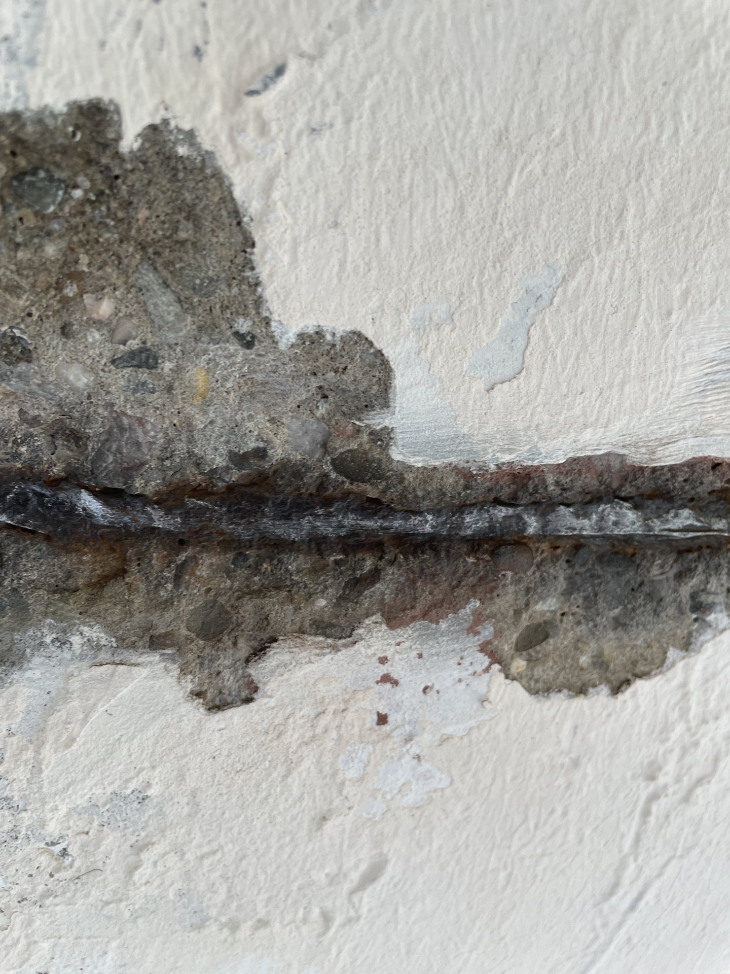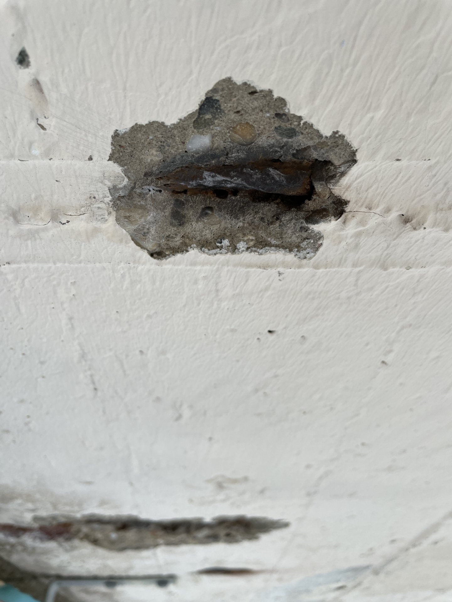 Durch die Feuchtigkeit die über die letzten Jahre reingekommen ist, ist der Bewährungsstahl auf der Unterseite an ein paar Stellen bereits gerostet und hat den Beton aufgesprengt.