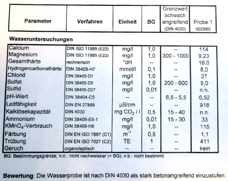 Im Zuge des Bodengutachtens wurde auch eine Wasserbrobe beprüft. Diese ergab ein "stark betonangreifend"es Grundwasser. Nach den von uns durchgeführten Recherchen wäre ein XA3-Beton notwendig. Die chemische Analyse zeigt aber nur bei einem Wert (Ammonium) Werte, die über dem Grenzwert für "schwach angreifend"es Grundwasser liegen, der pH-Wert liegt bei "mittel angreifend" bei kleiner als 5,5.