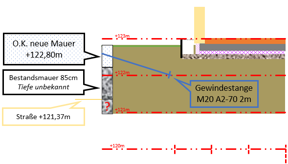 Diskutiere Stützmauer erhöhen und absichern im Tiefbau Forum im Bereich Neubau; Ich habe eine Bestandsmauer im Garten, Stahlbeton, 30cm stark und 85cm hoch, entlang einer abfallenden Straße ohne Geweg. Diese möchte ich erhöhen...