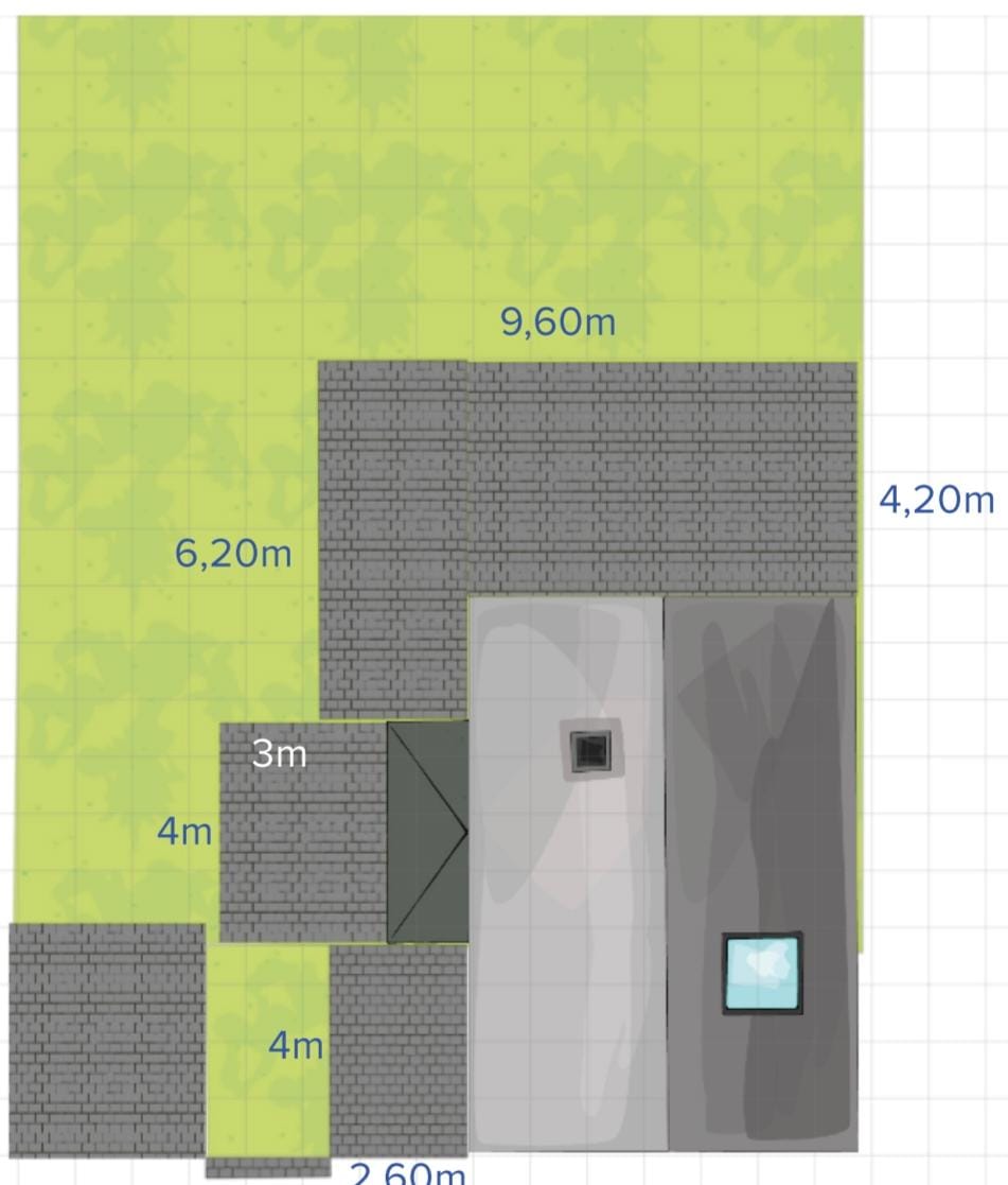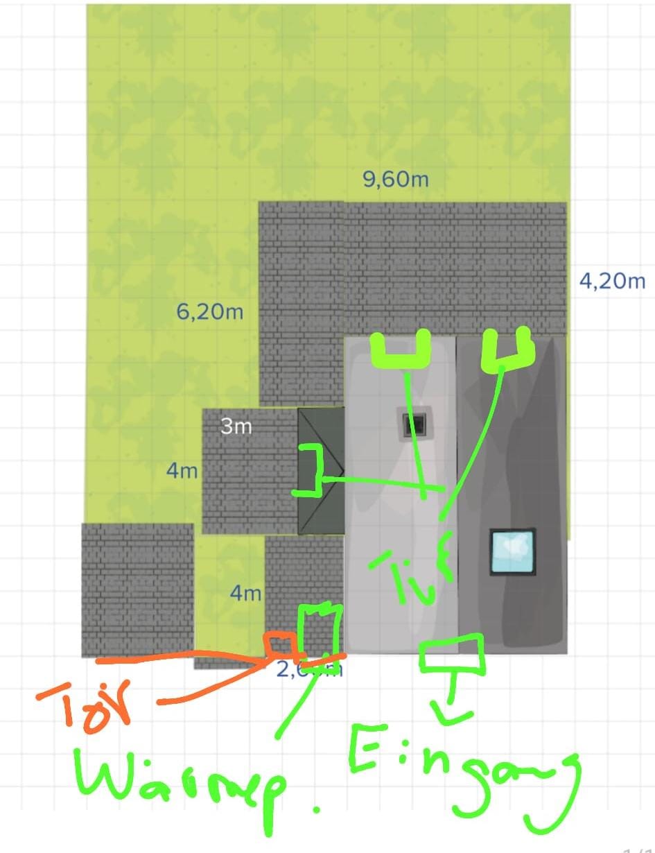 Bitte entschuldigt das zweite Bild, ich han da die Türen eingezeichnet damit man es besser versteht. Neben der Hauswand soll später ein Zaun mit einem Tor bzw. Tür kommen. Dahinter ist die Wärmepumpe.