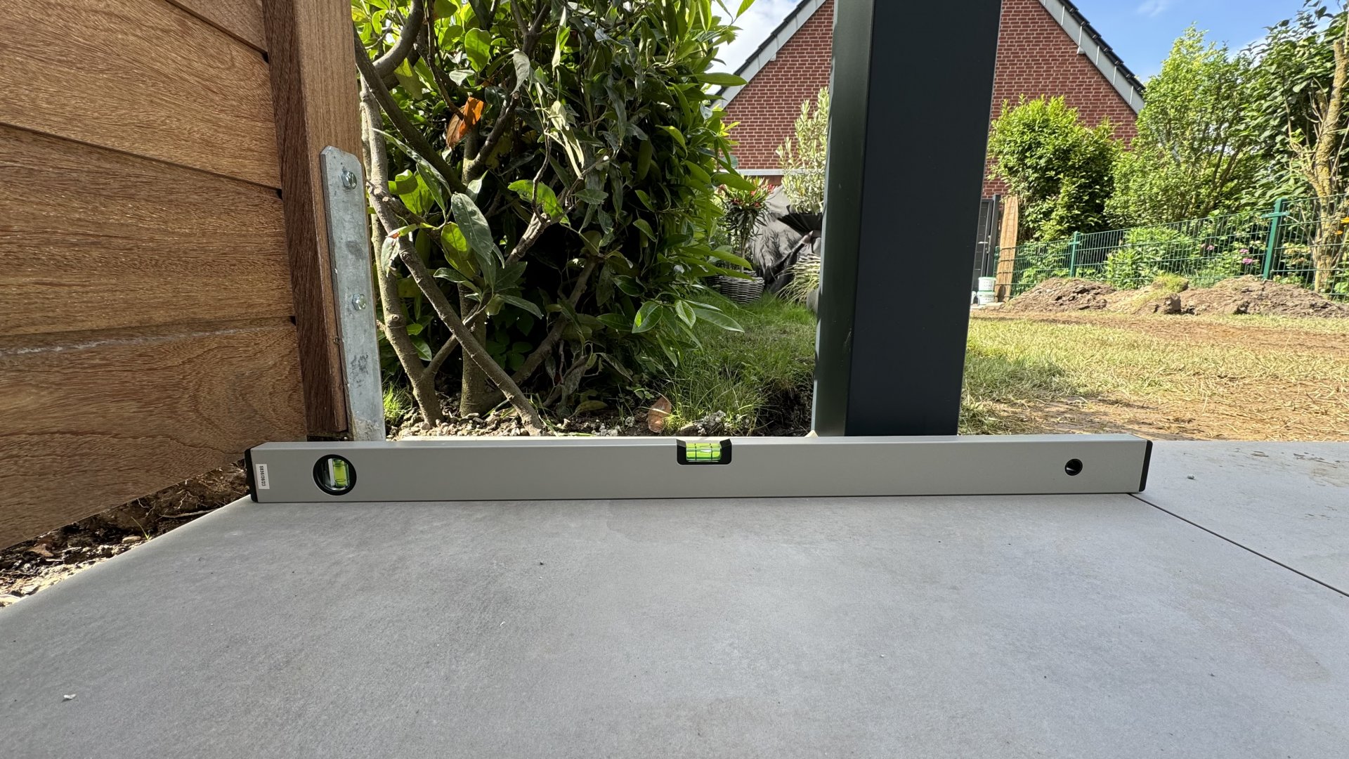 Wenn ich die Pfosten der Überdachung messe, haben wir ca. 4cm Unterschied zwischen rechten und linken Seite.