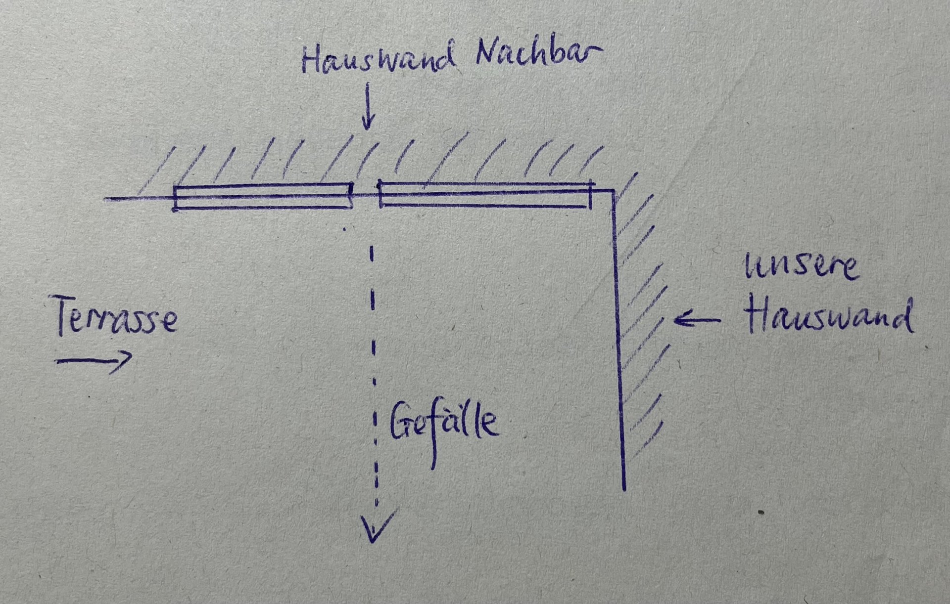 Diskutiere Terrassengefälle in eingeschlossener Ecke: fachgerechtes Design? im Sanierung konkret Forum im Bereich Altbau; Unser Nachbar hat seine Terrasse erneuern lassen. Die Terrasse liegt in einer eingeschlossenen Ecke zwischen zwei Hauswänden – eine Wand gehört...