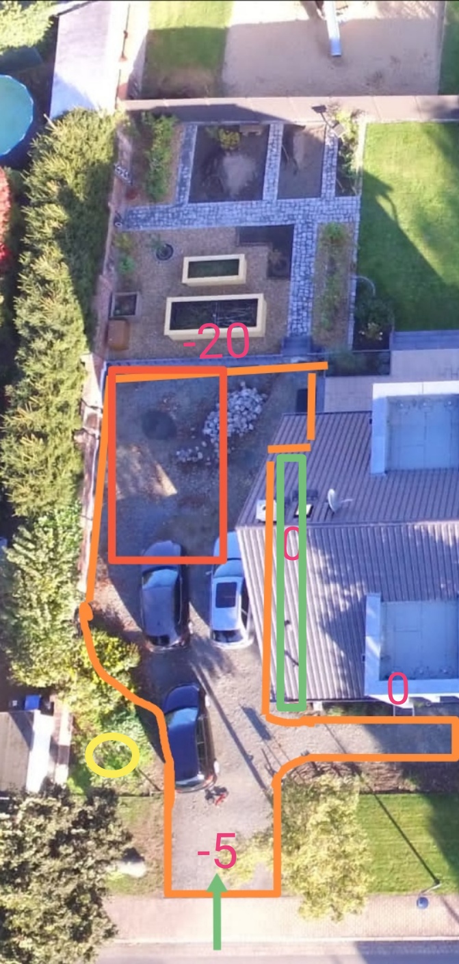 Idee: links vom Carport Mulde oder Muldenrigole vorsehen. Alle Gefälle vom Haus weg nach links.