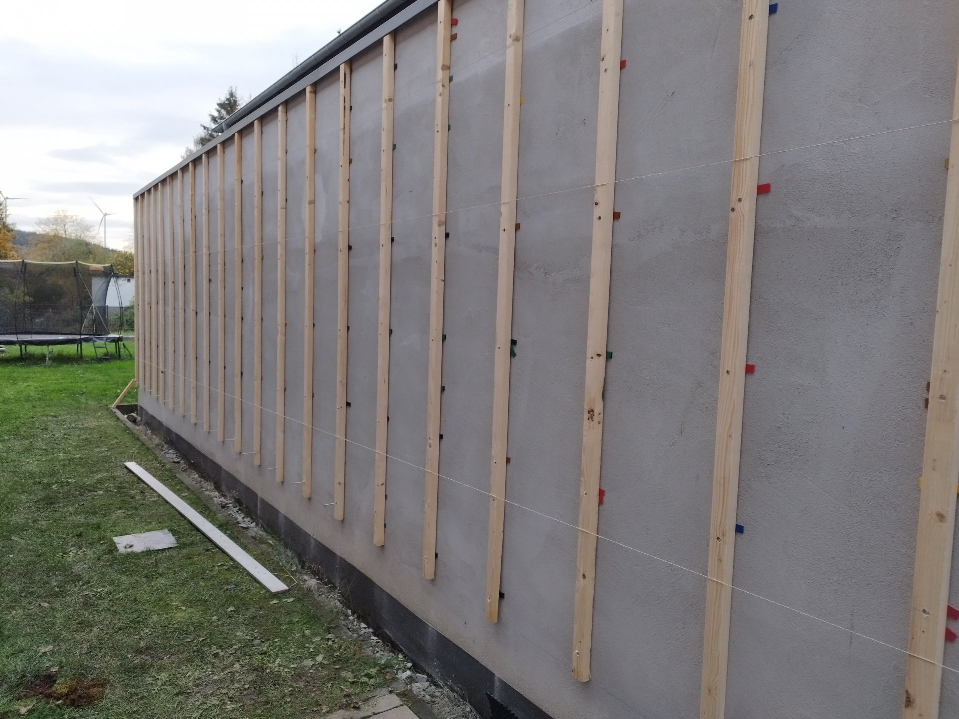 Ich hab jetzt an der ersten Wand mit der Konterlattung begonnen. Dabei habe ich festgestellt., dass meine wand sehr uneben ist und zusätzlich die Holzlatten nicht perfekt sind. Ich hab mir Schnüre gespannt und anhand dieser ausgerichtet. Allerdings bekomm ich manche Latten überhaupt nicht komplett ins Wasser. Ich hab hier und da Unterschiede von ca 1-2mm.
