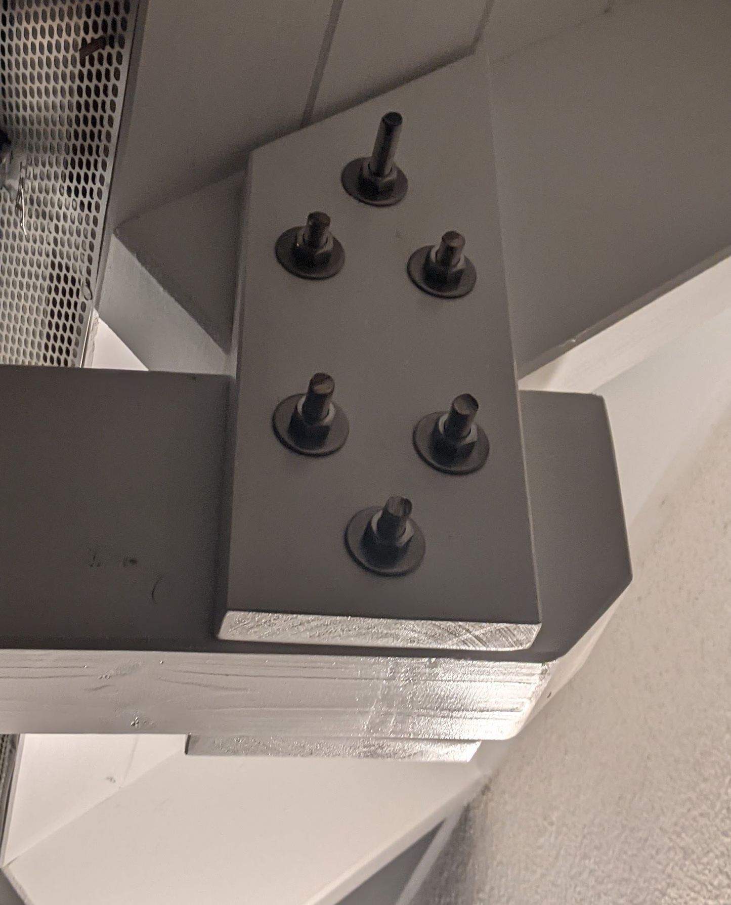 - Schrauben sind M12 und pressen quasi die Bretter an die Sparen und an das hängende Holzteil aneinander.