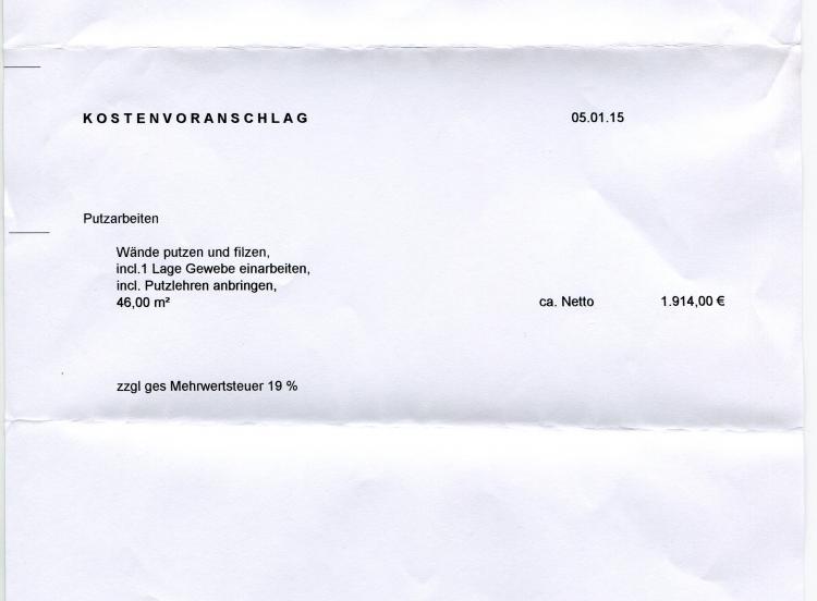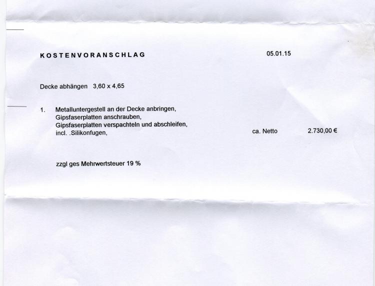 Diskutiere Trockenbau Decke Abhängen u. Wand putzen - Angebot im Baupreise Forum im Bereich Rund um den Bau; Liebe Forumsmitglieder, eine Verwandte möchte einen Raum im Haus sanieren und bekam zwei Angebote eine örtlichen Baufirma, ( ich hänge die...