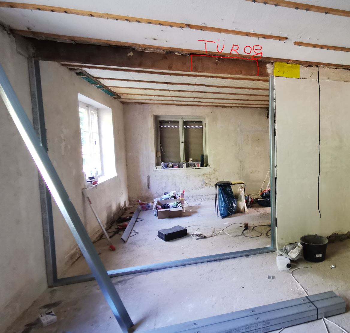 ich habe versucht Antworten zu finden, jedoch vergebens. Vielleicht kann hier jemand weiterhelfen. Ich saniere aktuell einen Altbau von 1939. Beim entkernen wurde ein Holzbalken vorgefunden (siehe Bild). Der Vorbesitzer hat eine zweireihige Ziegelwand entfernt und die einreihige Wand im OG mit Holzbalken abgefangen. Der Holzbalken liegt auf der rechten Wand auf (1 Reihe Ziegel, Breite ca. 12 cm, Auflage ca. 25 cm, gelbe Markierung) und links im Wandmauerwerk (Auflage ca. 20 cm ) auf. Der Holzbalken ist 10 cm breit und 25 cm hoch. im OG ist noch eine Tür gesetzte, also keine durchgehende Wand. Nun soll der Raum wieder abgetrennt werden, hier durch eine Trockenbauwand. Im rechten Bereich (hinter schwarzem Strich befindet sich der Kamin).