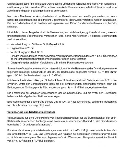 In diesem Gutachten wird die Abtragung des Boden bis 1m unter GOK und die Auffüllung mit einem Sand/Kiesgemisch mit Lagenweiser Verdichtung und bestimmten Eigenschaften (Kornabstufung ca. 0/45 mm, Schluffanteil ≤ 3 %) gefordert, um einen Sohldruck von 150 kN/m² zu erreichen.