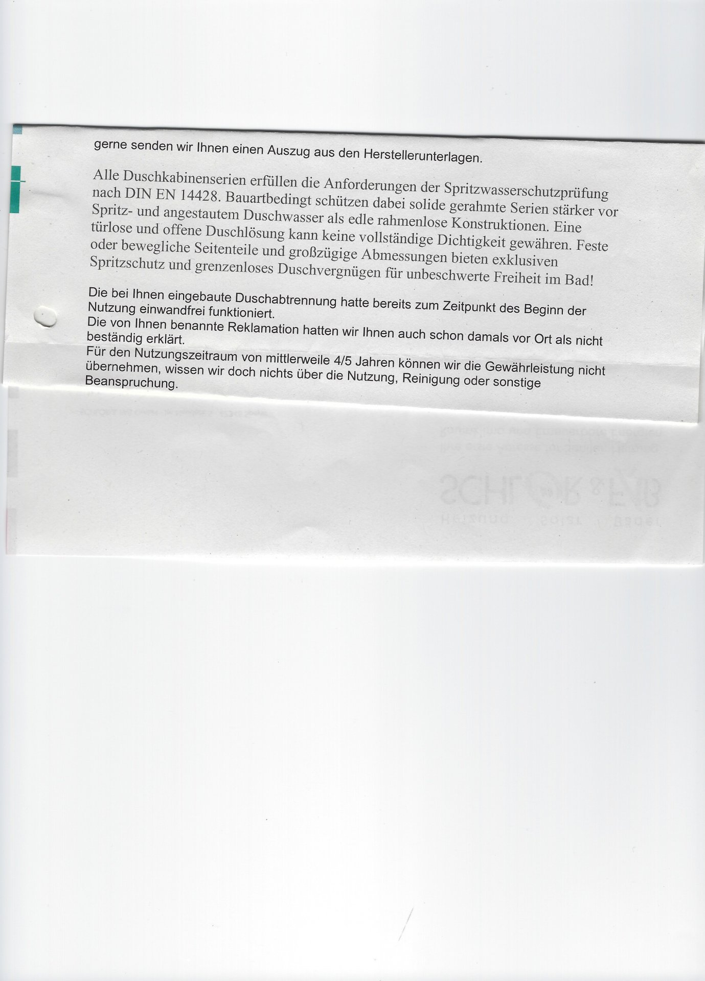 Anbei Fotos von der Duschkabine sowie das Schreiben der Sanitärfirma, wie man sieht läuft das Wasser an der Ecke unten raus, die Dusche wird ganz normal benutzt und die Undichtigkeit bestand nachweislich bereits seit Anfang der Nutzung, die Gewährleistung besteht noch bis zum 31.12.2018.