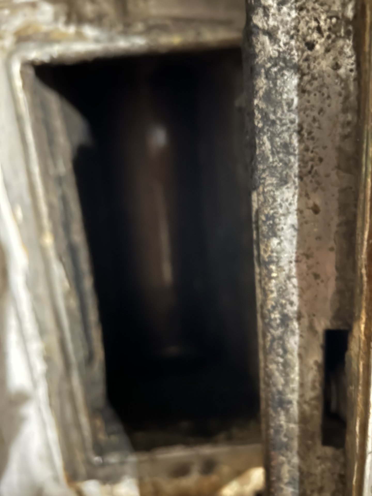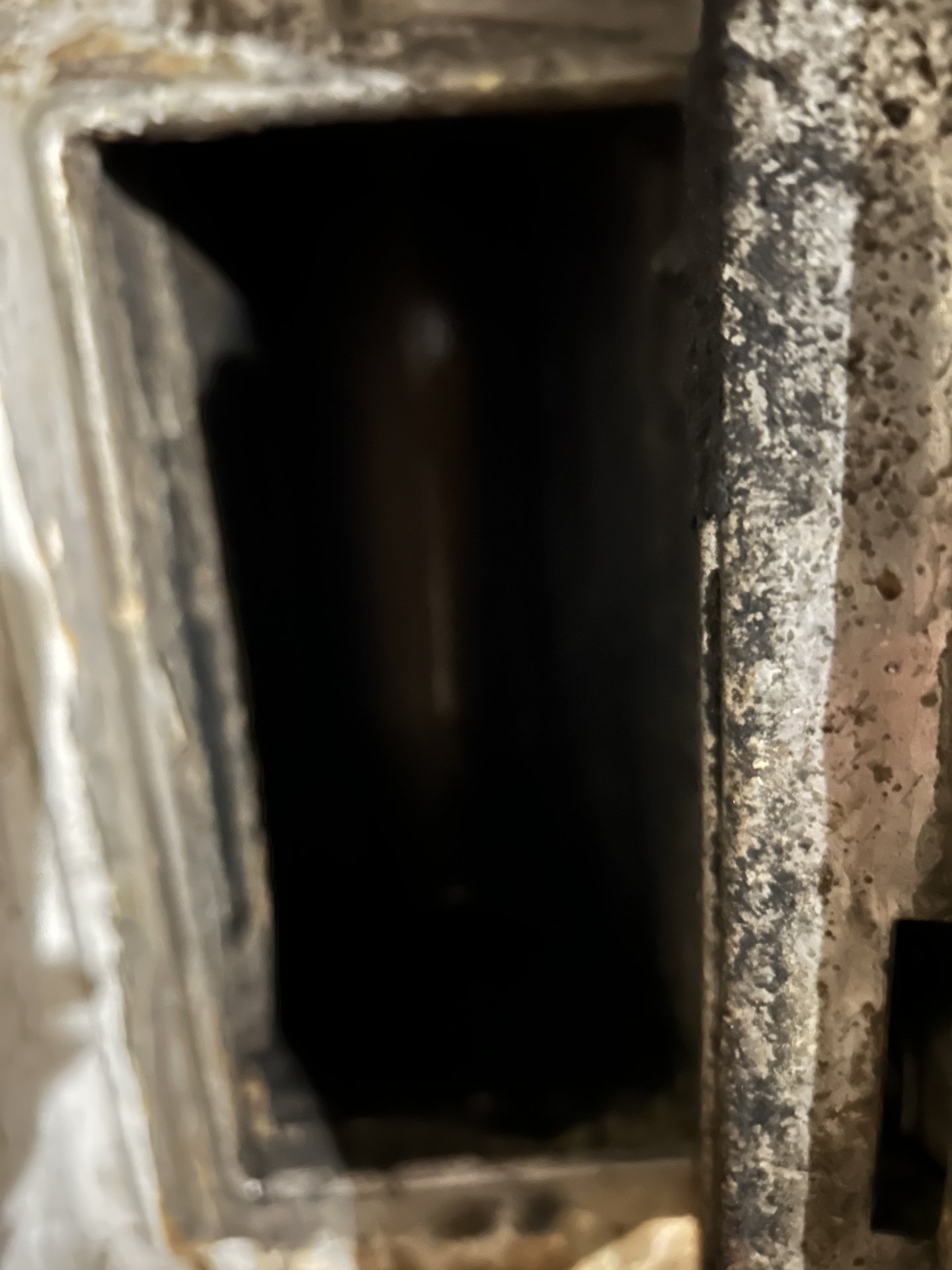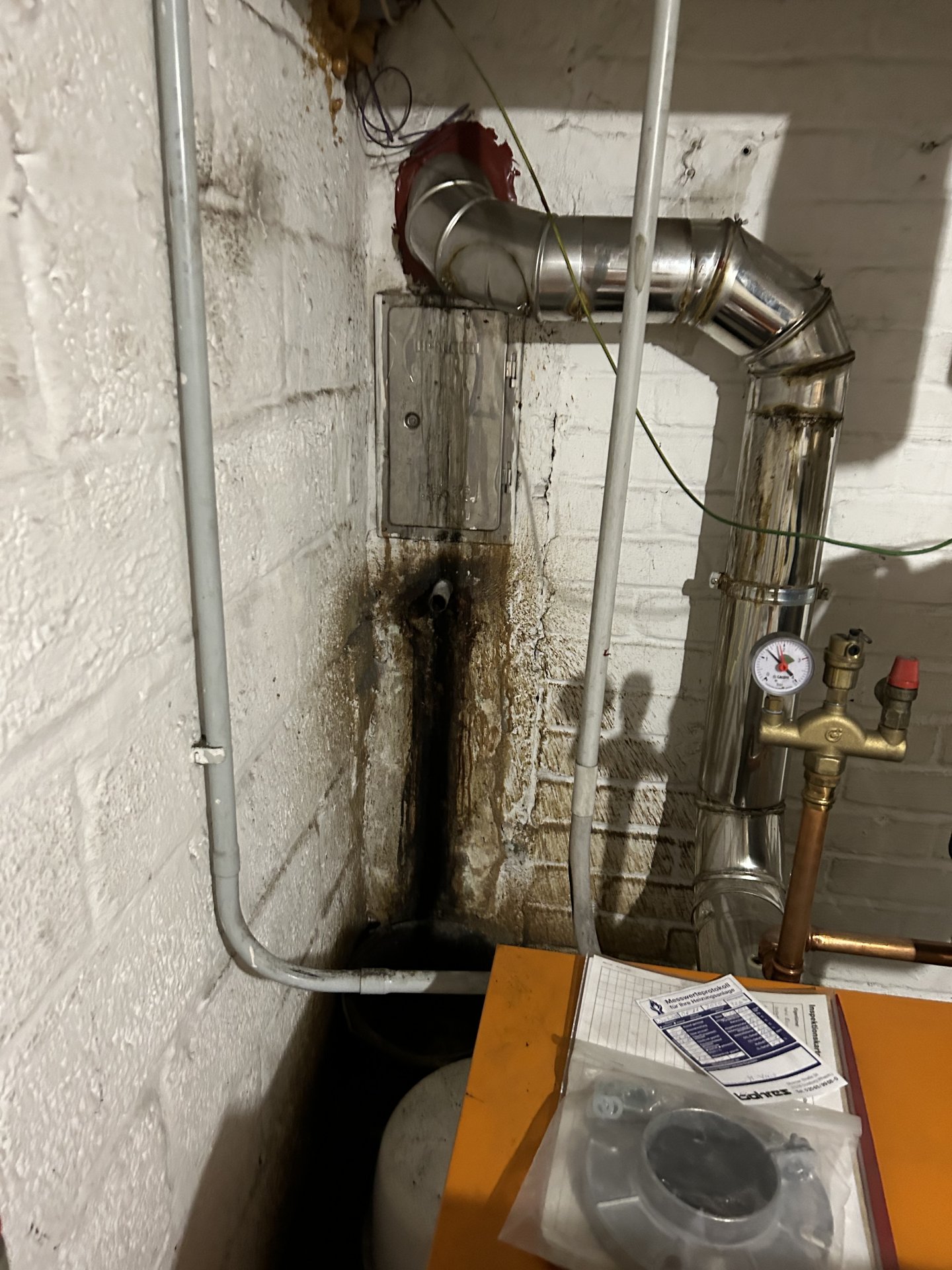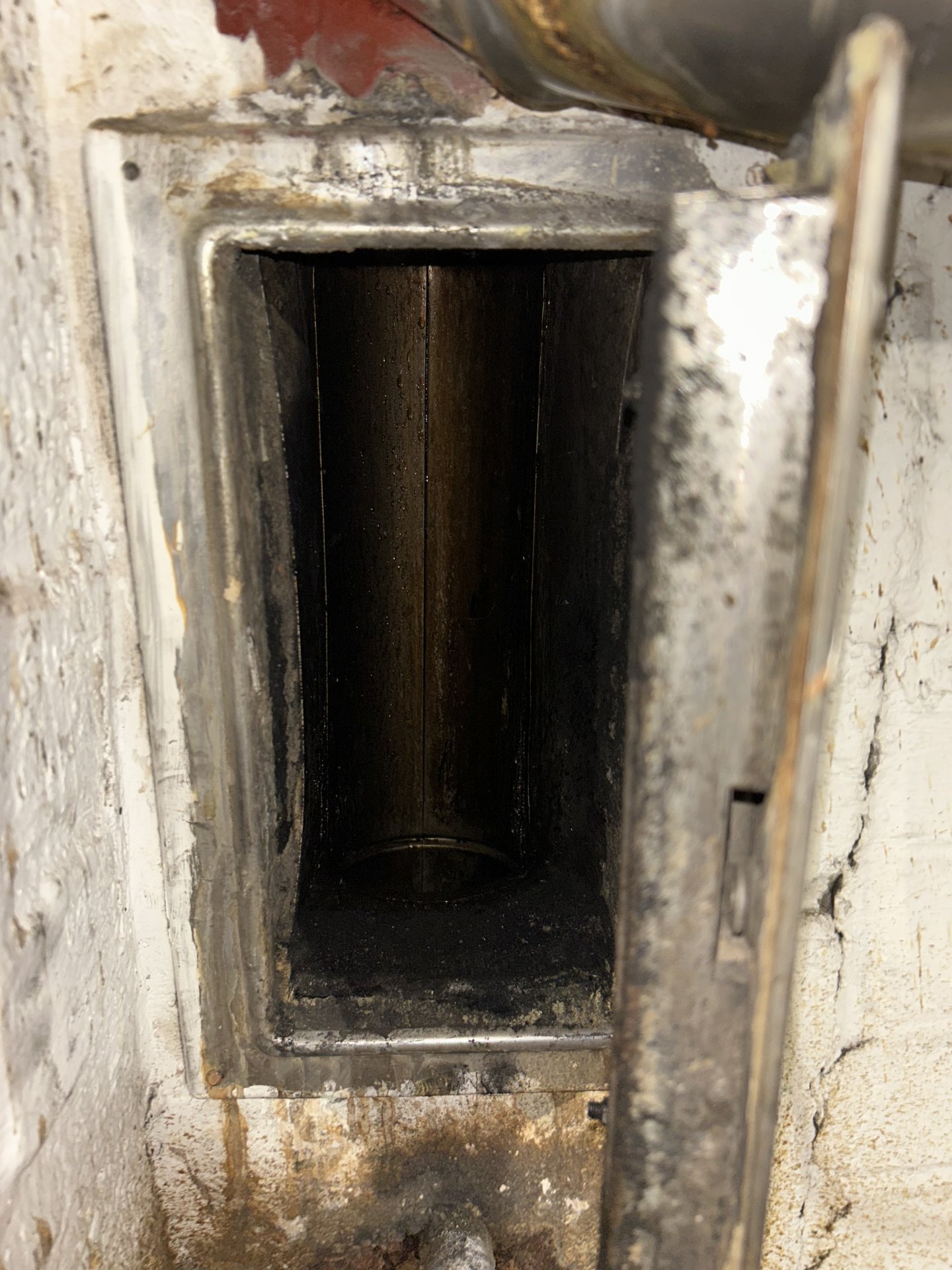 In unserem EFH aus 1958 wurde anfangs mit Kohle geheizt. Im Heizungskeller ist unter dem Kohleschacht ein Rohr, welches mMn als Luftzufuhr gedient hat. Skurrilerweise ist der Flansch des Rohres an der Wand undicht und bei Regen tropft es die Wand hinunter. Wie man auf dem Bild erkennt, nicht erst seit Kurzem.
