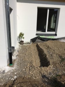 Die Noppenbahn hat der Putzer aber mächtig eingesaut. Kommt da nochmal ein richtiges Stück Fallrohr?