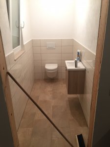 Auf dem einem Foto sieht man die ganzen Rohre und Leitungen und auf dem anderen Foto steht plötzlich die Wanne.