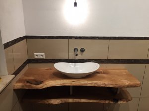 Den Waschtisch find ich geil, optisch mit dem Becken und dem Auslauf super. Alltagstauglich ist das alles aber leider nicht - zumindest bist da ständig recht umständlich am putzen (vor allem als Trockenrasierer). War lange auch Traum bei uns, hatten es dann in der Neubau-Mietwohnung und daraus gelernt.