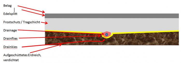 Wozu soll man hier vollflächige Drainnage einbauen? Oder habe ich einen Denkfehler in meinen Überlegungen? Ich hab hier mal ein Kunstwerk angefügt... :-) Was will ich da mit einer vollflächigen Drainage? Oberflächenentwässerung durch die Gullis und das Sicherwasser dann durch Drainage... Unbenannt.jpg