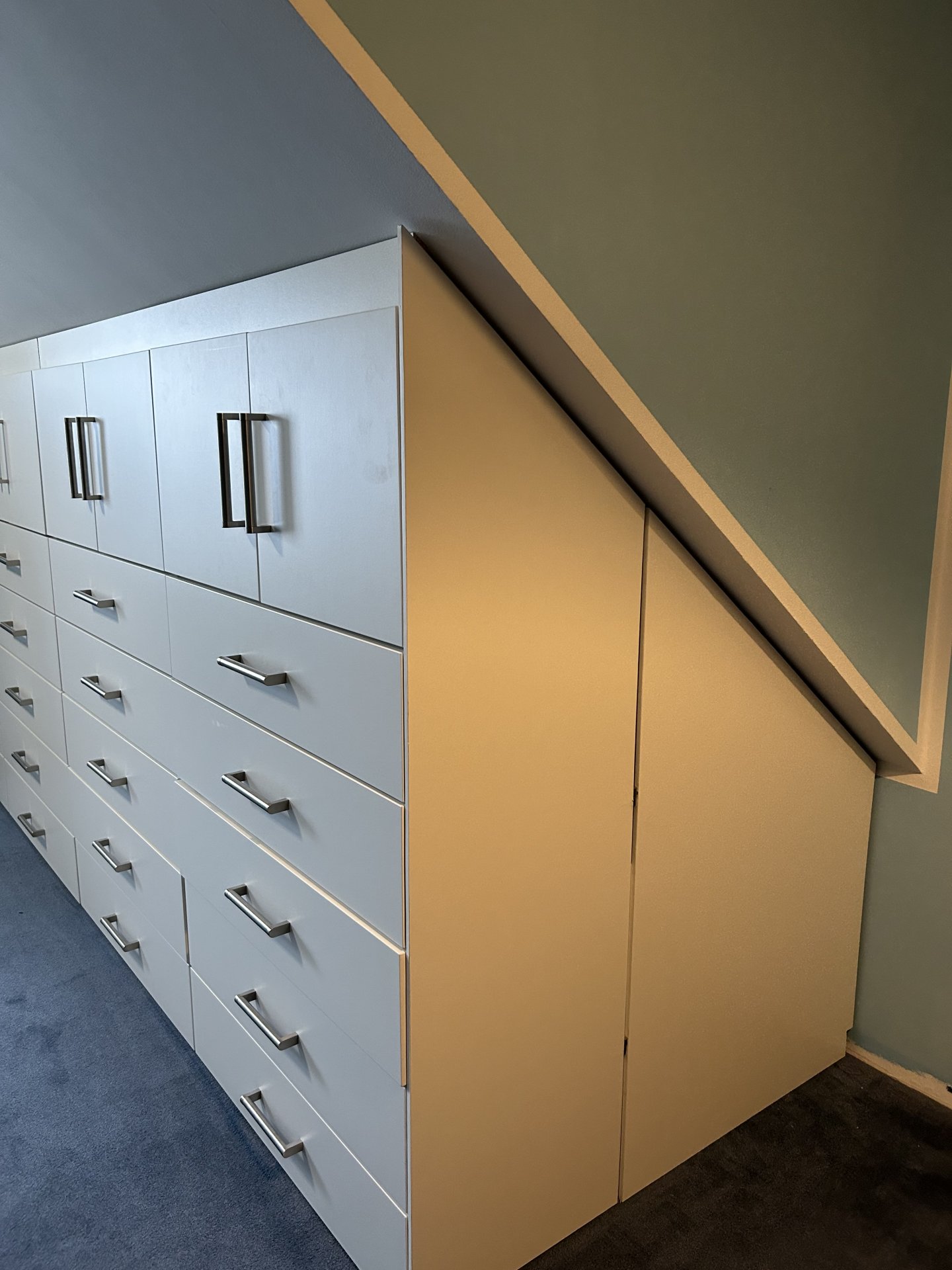 Ggf einfach mal einen guten Einrichteplaner nehmen und mit ein paar neuen Möbeln (Ikea und co) den Raum neu verändern. Es gibt so viele Möbel, die sich für Dachschrägen eignen und kommt preislich besser :)