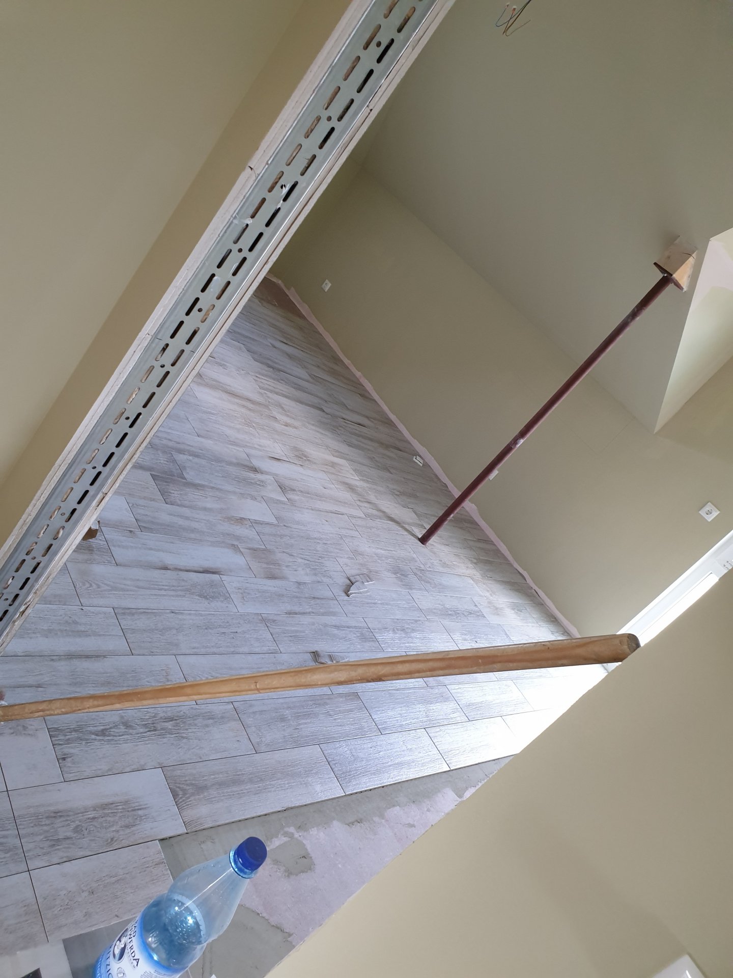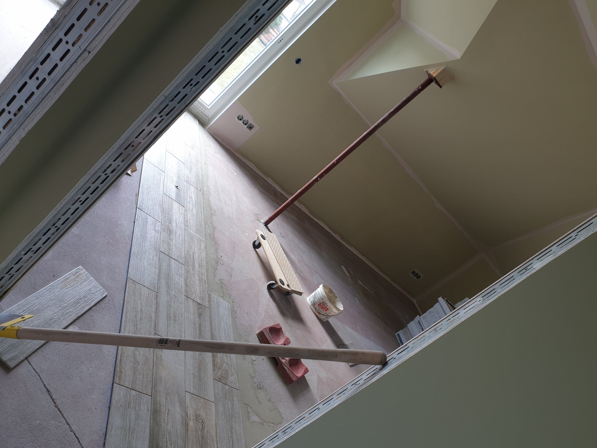 Vom Dach her geht die Trockenbauwand in eine kleine Holzspitze Dachstuhl über, an die sich die Stahlstütze anschließt, die Böden sind alle gefliest.