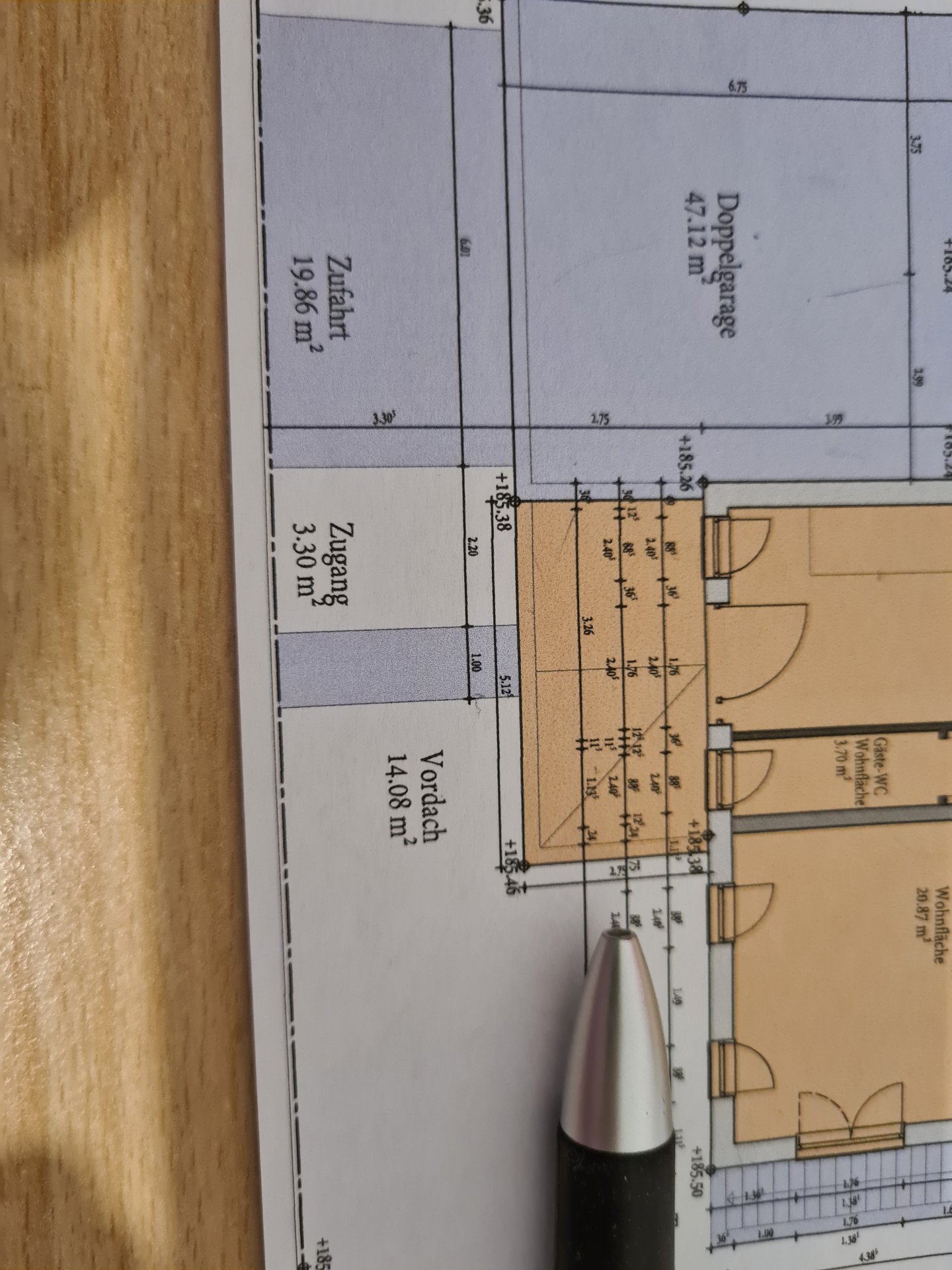 Bei mir soll vor die Hauseingangstür ein Vordach grob 2,75m x5,20m in einer Linie mit der Garage (siehe Bild).