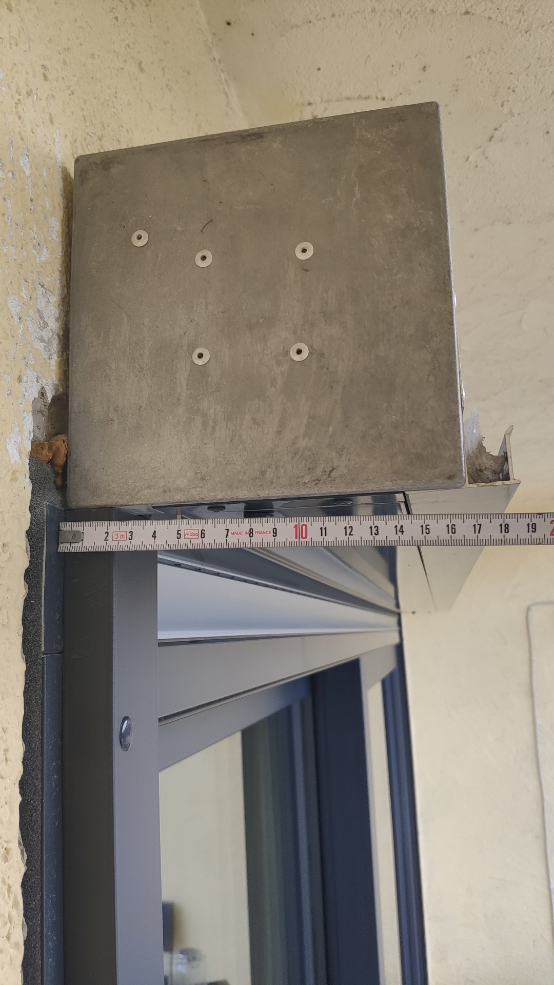 Nun verstehen wir nicht wie das ganze nachher ordentlich verputzt werden soll, der Rolladenkasten hat nach vorne hin eine Schiene für eine 15mm Putzträgerplatte und einer Tropfkante nehme ich an mit einer Ausladung von 18,5 manchmal auch mehr, je nachdem wie lotrecht die Wand ist.