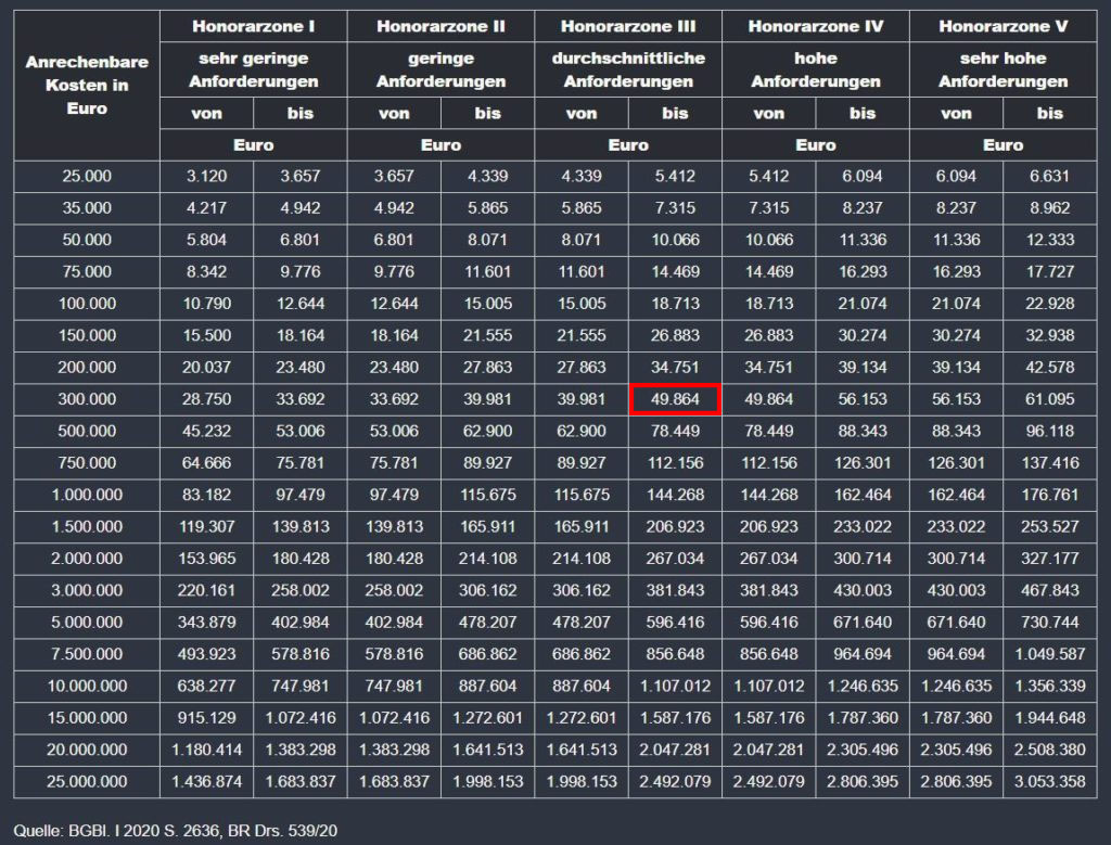 Kurz zusammengefasst: Ich habe die BGF ermittelt, diese mit den Baukosten (3 K/m²) multipliziert und dann in der Tabelle (siehe oben) den Honorarsatz ermittelt. z.B. Bausumme 300 K, Honorarzone III, Höchstsatz 49.864€. Diese entsprechen dann den nach LP1-9 100% Honorar.