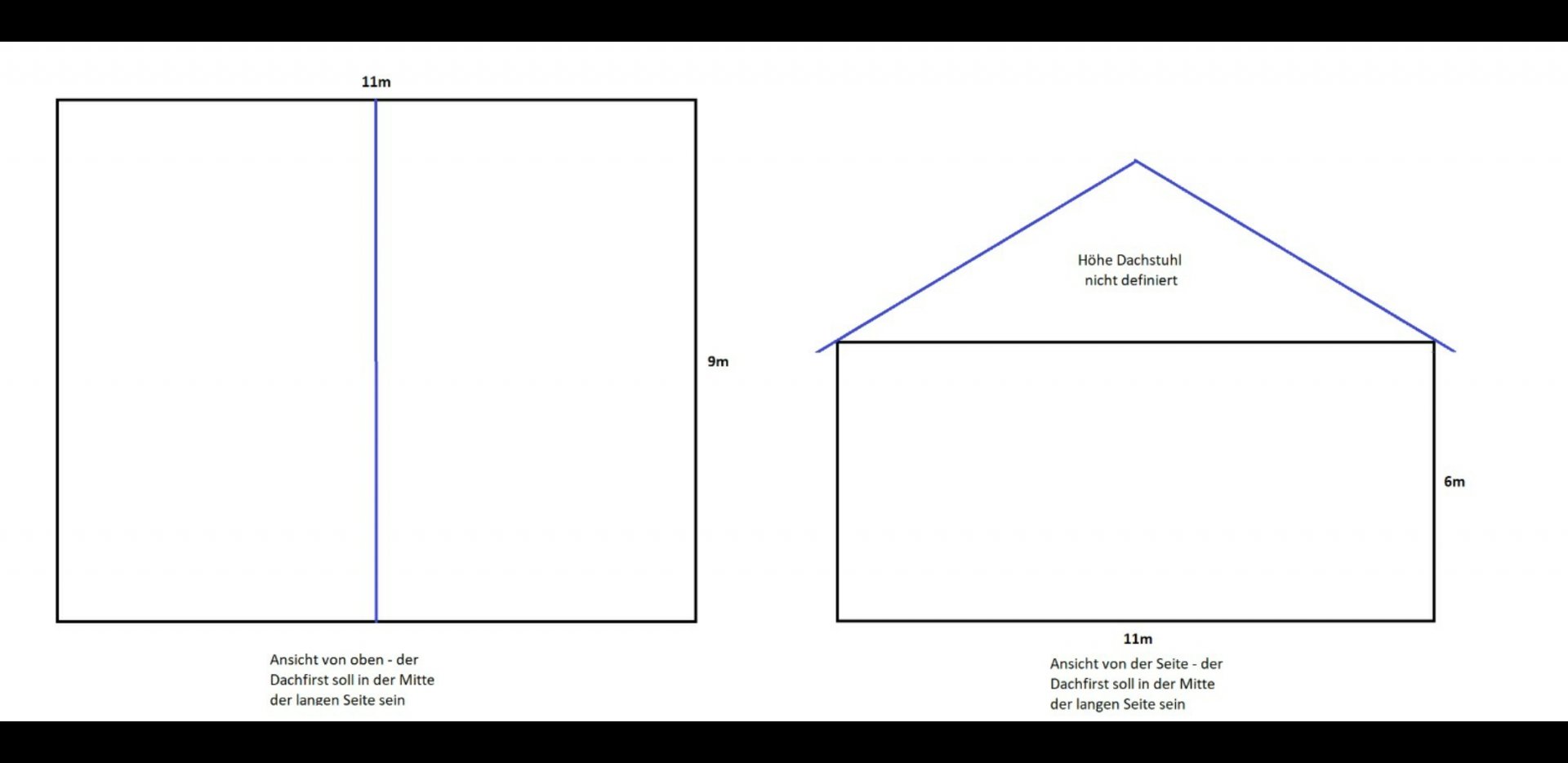 Dass unser Wunsch unüblich ist, wissen wir. Aber alleine wegen der Abstandsflächen ist leider kein First über die lange Seite möglich, weil der Giebel hier ja mitzählt.