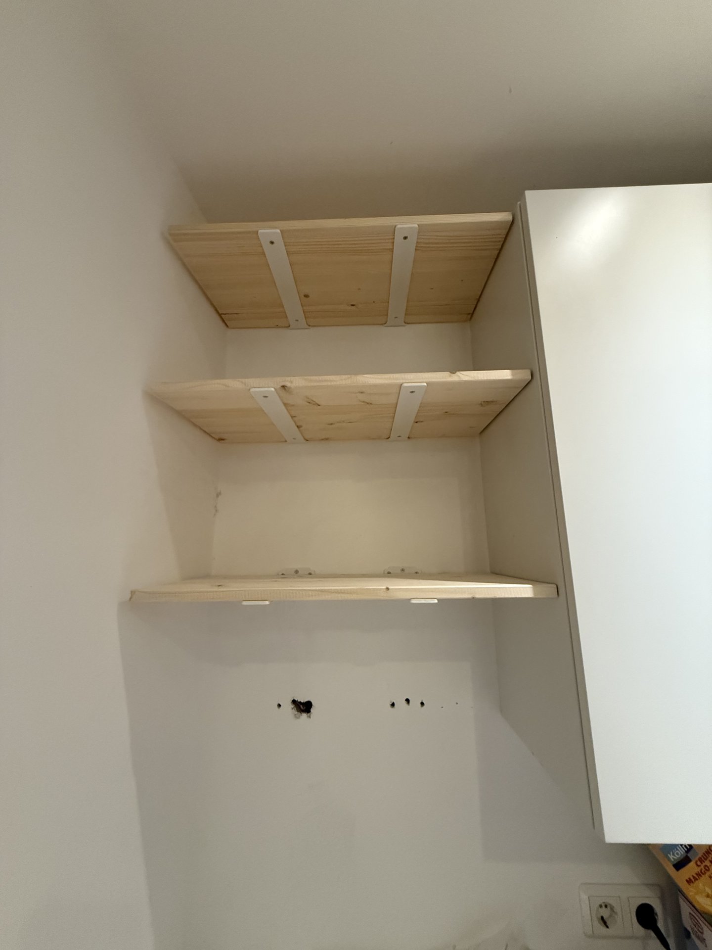 Das Wandregal – ob Board oder Bretter, irgendetwas dazwischen wird es schon sein. Die Wand ist an manchen Stellen etwas hohl und dann wieder massiv aus Beton. Ich habe keine Ahnung warum das so ist.