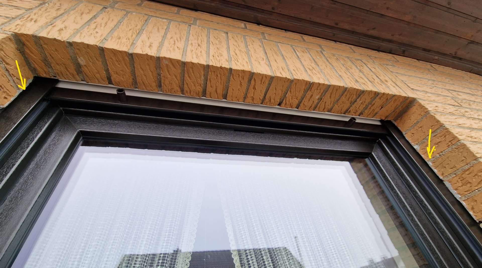Ich kann so gut wie keine Mängel beim Fensterbauer erkennen. Nur auf dem Foto mit den zwei gelben Pfeilen hat sich das Kompriband umgeklappt, das bekommt man aber leicht korrigiert.