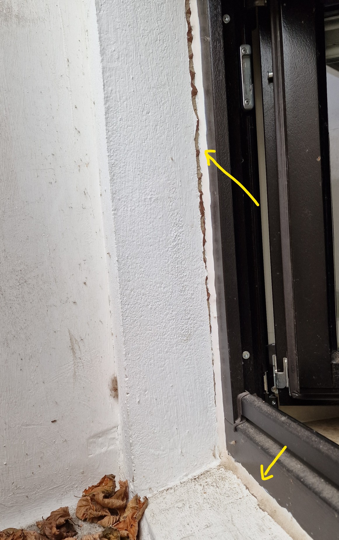 Schau mal bei den Stellen zur Fensterbank, ob dort nicht auch ein Kompriband oder ähnlich unter dem Fenster ist.