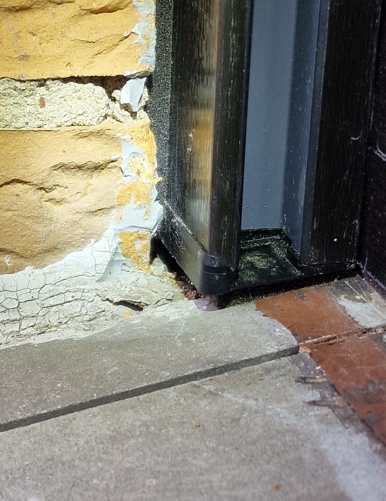 Speziell dort, wo beim Ausbau der Fugenmörtel beim Klinker herausgebrochen war, in den Ecken unten, wo es keine Fensterbank gibt (Kellerfenster) und oben: