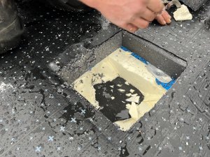 Zum wegdampfen des eingeschlossenen Wassers kann er auch Entlüftungshauben auf die Dachhaut aufschweißen.